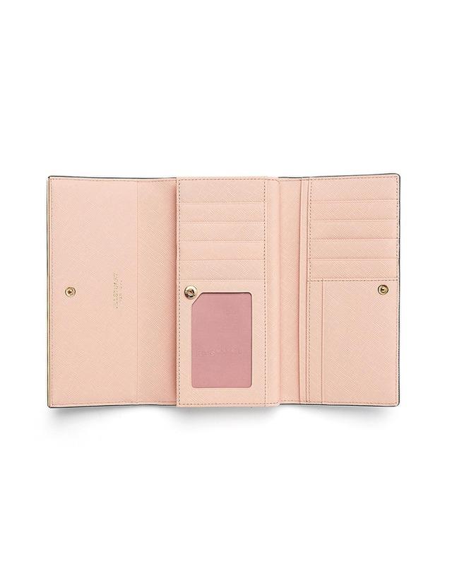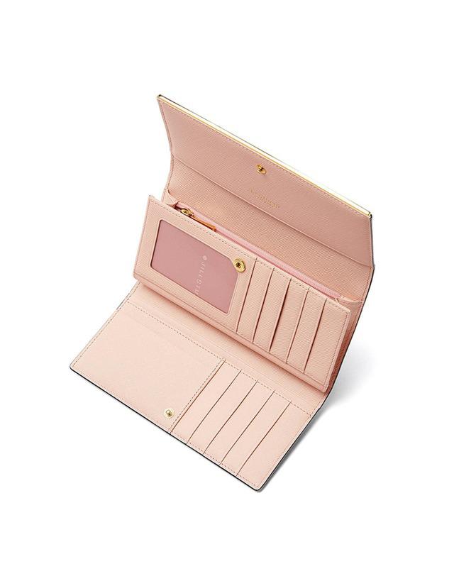 골드 바와 로고 장식으로 포인트를 주었으며 내부 배색으로 세련된 외관을 연출한 장지갑입니다.