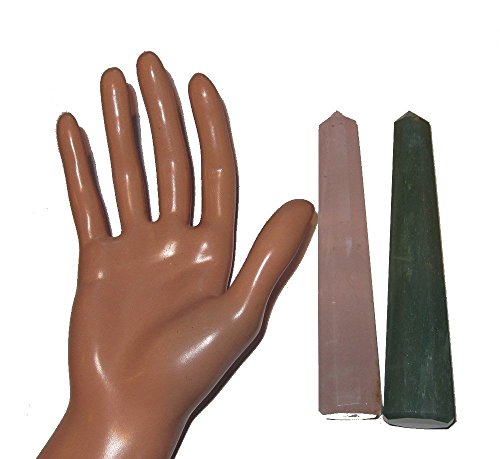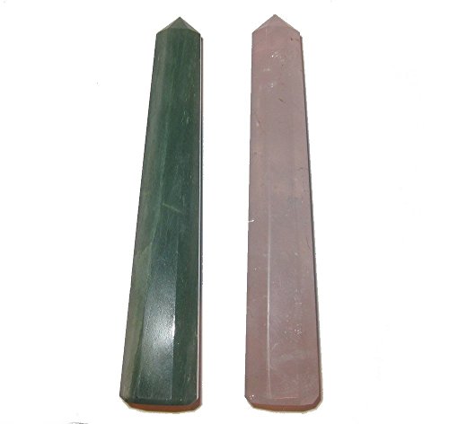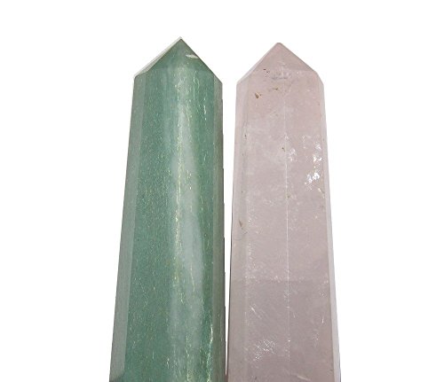Your set contains a Rose Quartz and an Aventurine tower. This is attractive soft pink Rose, with clarity that shows rainbows and inclusions within. The aventurine is olive green with sparkling mica and white patterns. They have been faceted into 8 sides that come to a point, and can stand tall or be used as healing wands. Great for the heart chakra, as pink corresponds with the upper heart and green with the heart. Receive the exact one featured when you order from Satin Crystals.
