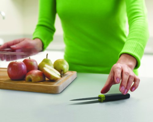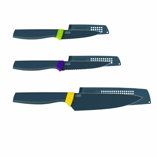 - Feature : Innovative 3-piece knife set by Joseph Joseph / Stainless steel blades with non-stick, silicone coating / Unique handle design raises blade off work surface / Set includes paring, serrated and chef's knife / Hand wash only and dry immediately