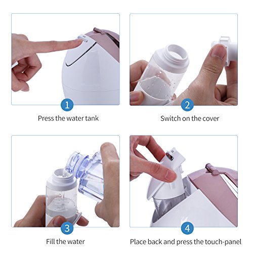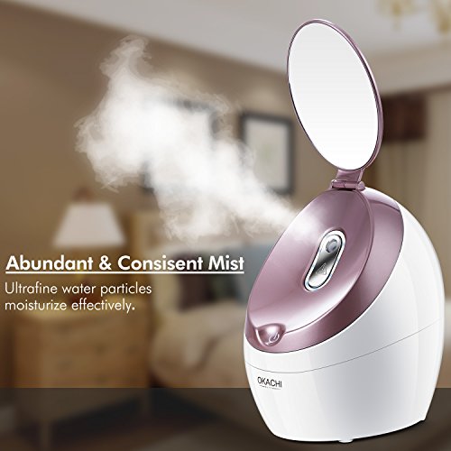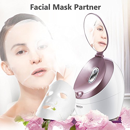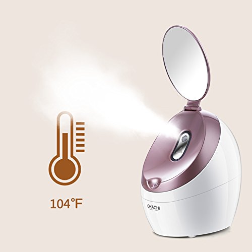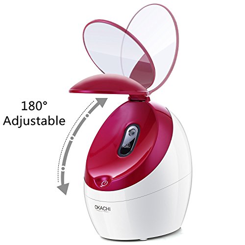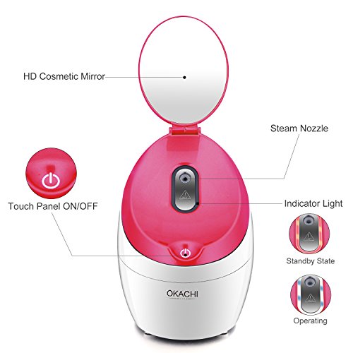 -. Feature : Powerful Steams: The facial steamer nozzle sprays strong, steady, wide and thick steams, covering entire face. Nano-sized steams easily penetrate the skin barrier, moisturize skin more quickly and absorb nutritional essence more effectively.【BONUS】Get Free Facial Massager, please read the gift card attached in the package and contact us. / Multifunctional New Type Steamer: 4-in-1 facial steamer is not only good for face cleaning and skin care, but also can be used as a humidifier and a makeup mirror. A large 80 ml water tank , the mist can last for about 15 minutes of working time with a completely silent operation, long running time. Also you can fix the facial mask through the mirror / Smart Touch Switch and Auto Shut-off: The atomizer has an anticreep touch-panel for operation, which is easy and safe for your beauty routine. Facial steamer will auto shut-off if there is no water in the water supply tank, preventing any injury. Enjoying spa-like facial sauna treatments at home, anytime you want / Spa Facial Treatment: Promotes collagen regeneration,makes skin clear and bright, 10x improved blood circulation, improves cell vitality for a healthier younger looking complexion, reduces acne and blackheads, weakens pigmented spots, kills skin bacteria, and suppresses acne, restores smooth and delicate skin, promotes drainage of sinuses and airways for overall improved well being / High-end Manufacture: Sleek Design with the single-side mirror (HD scratch resistant)and streamlined appearance, easy to use and portable. It's convenient to complement your dresser, table, bathroom cabinet and etc.The water tank is made by ultra-high grade, durable, heat - resistant and eco-friendly premium material, does not have any plastic smell