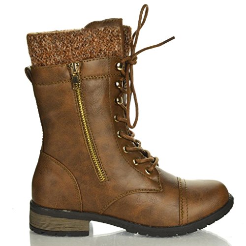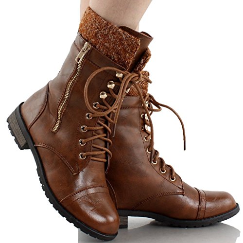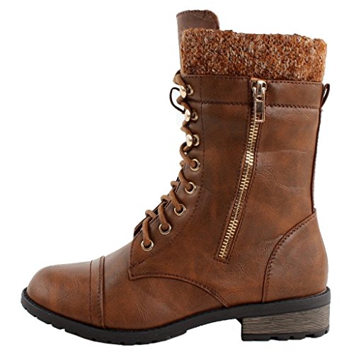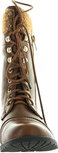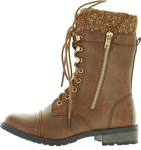 Forever Link Womens Mango-31 Round Toe Military Lace Up Knit Ankle Cuff Low Heel Combat Boots