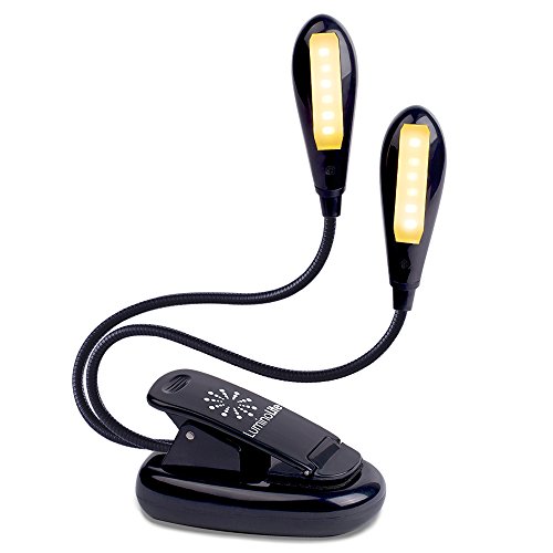 LuminoLite Rechargeable 12 LED Eye-Care Warm Book Light, Sturdy Clip On Bed Reading Light, USB Music Stand Lamp, 6 Brightness, 2 Goosenecks Light up 2 Full Pages. Perfect for Bookworms & Music Players