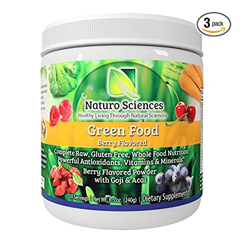 Natural Greens Food By Naturo Sciences - Complete Raw Whole Green Food Nutrition with Super Powerful Antioxidants, Vitamins, Minerals with Goji and Acai - Amazing Berry Flavor 8.5oz (240g) 30 Servings, Pack of Three - 90 Servings Total