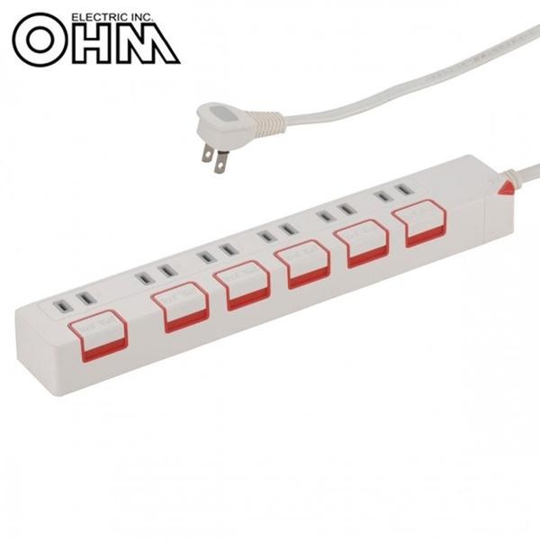 押しボタン式省エネスイッチの節電タップです。耐熱難燃樹脂を使用しているので熱に強いです。 生産国:中国 ※サプライヤー直送品 ご注文後2~3営業日後の出荷となります【商品名】OHM 押しボタンスイッチ付き 節電タップ 6個口 1.5m HS-T1179W