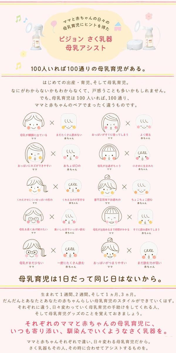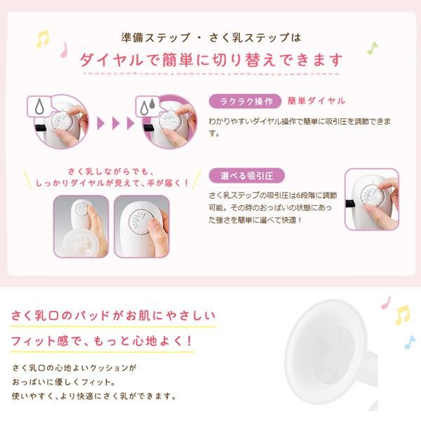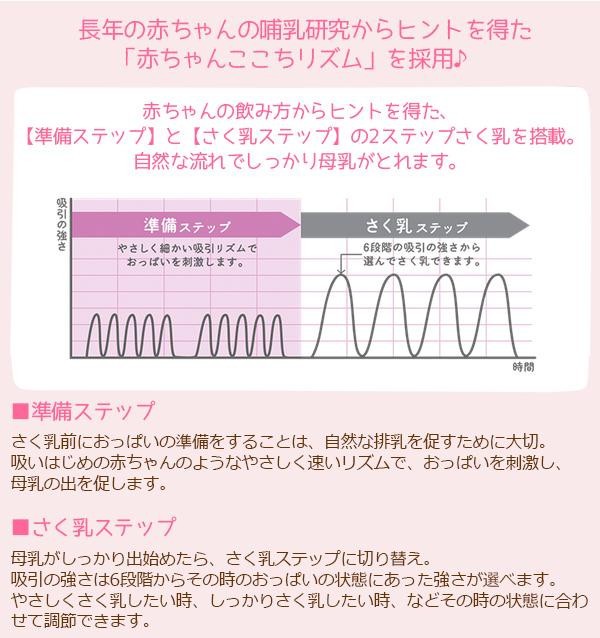 おっぱいにあてているだけで、自動でさく乳ができ、手の負担も少ない電動タイプです。さく乳中でもママ自身が吸引の強さを調節しやすいダイヤル位置になっています。長年の赤ちゃんの哺乳研究からヒントを得た「赤ちゃんここちリズム」を採用。 |