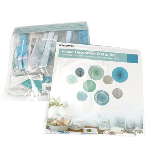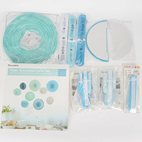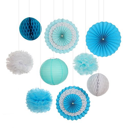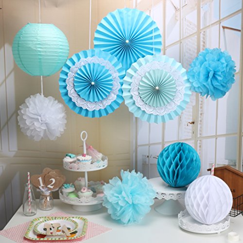 Party Decorations Baby Shower Set,RiscaWin Paper Fan,Tissue Paper Pom Poms ,Paper Lanterns,Honeycomb Balls (Set of 9),Blue