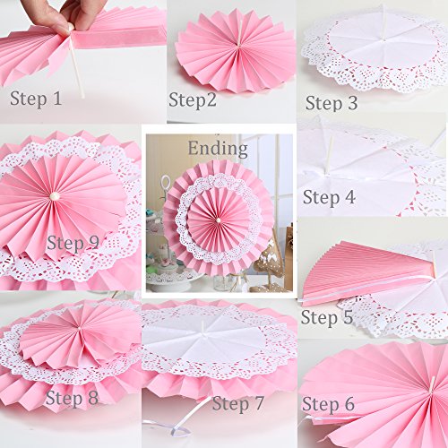 9 pieces of party decorations containing 3*10 InchTissue paper pom poms, 1*10 Inch paper lanterns,2* 8 Inch paper honeycomb balls , 1* 12 Inch one layer paper fan and 2*12 Inch three layer paper fan