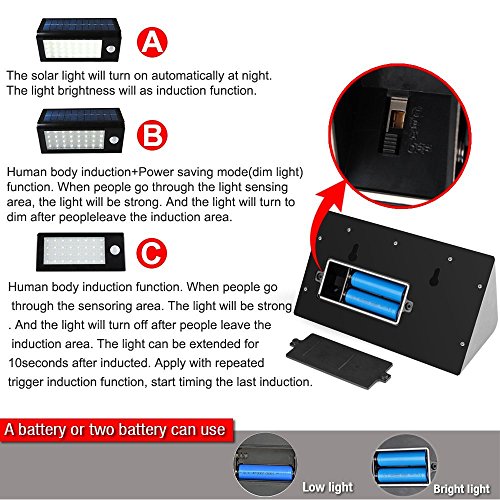 3 Intelligent Modes, A(Half bright light mode), B(Motion Sensor+Dim Mode), C (Motion Senor with Strong Light).