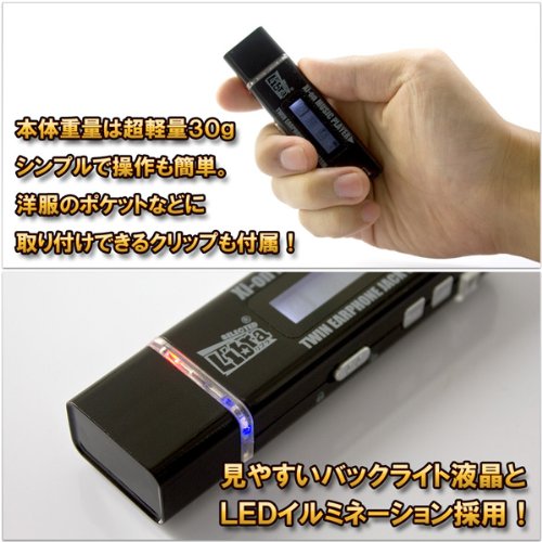 -. Feature : Wイヤホンジャック搭載のMP3プレーヤーです / 対応メディア microSDHC32GBまで対応(別売り)。対応フォーマット MP3,WMA(著作権保護されていないもの) / FMラジオ 76.0~90.0MHz。充電時間 約2時間。連続再生時間 約3時間 / 主な機能 1曲/全曲/フォルダ/A-Bリピート。付属品 イヤホン2本、クリップ、本体、日本語取説 / 本体重量約30g。本体サイズ 約90*15*25mm。※ボイスレコード機能は搭載していません。
