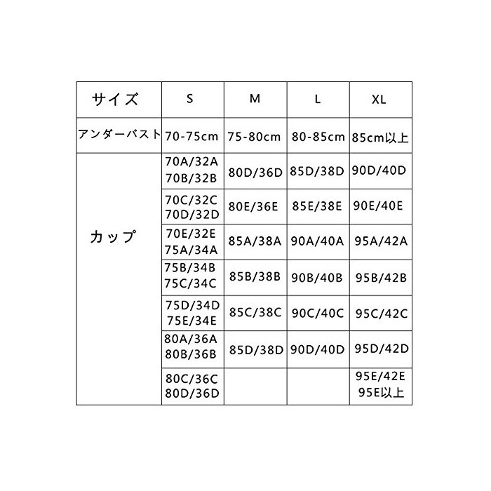 사이즈:S-XL S:75/3480/36D의 분(쪽,편)용 언더 바스트7075cm 바스트84cm이내 M:80/36D85/38D의 분(쪽,편)용 언더 바스트7578cm 바스트94cm이내 L:85/38D90/40D의 분(쪽,편)용 언더 바스트7984cm 바스트99cm이내 XL:90/40D전후의 분(쪽,편)용 언더 바스트85이상 바스트99cm이상