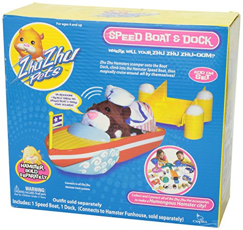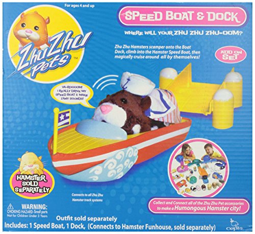 Let your Zhu Zhu Pets Hamsters have a taste of life on the high seas, with the Speedboat and Dock Playset. Either use this vehicle playset alone, or attach it to the Zhu Zhu Pets Hamster Funhouse Deluxe Playset to speed your hamsters on their way. Your Zhu Zhu Hamster then dives into the Boat Dock, climbs straight into the Hamster Speed Boat, and immediately starts cruising around all by themself ! Zhu Zhu Pets Hamster Speedboat and Dock Playset is perfect for encouraging roleplay for young girls and boys. Please note: Zhu Zhu Hamsters sold seperately.Feature