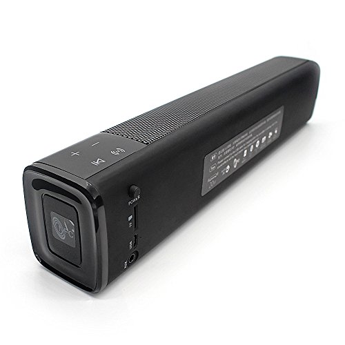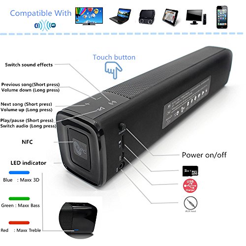 -. Feature : TOUCH CONTROLS: Switch DSP 3 sounds effects modes(Maxx Treble,Maxx Bass,Maxx surrounds) create room-filling high-quality surround sound. Mids and highs are clean and crisp, voices are clear, with deep/tight bass to Movies, Music, Television Shows, and Games for your entertainment stand. Enhanced Frequency Response In each mode,you can throw a party, transform your room into a theater, and wind down - all at the touch of buttons. / EXCELLENT STEREO: Mobile home theater. Enjoy truly enveloping, immersive, expansive, virtual surround sound. through dual high-performance drivers (10W * 2) and passive subwoofer with an enhanced frequency response range of 60Hz - 20kHz. Superior sound quality is amazing loud and clear! it will give you as close to a actual surround sound experience as possible, / PORTABLE SPEAKER: The Aluminum alloy body design is sleeker, slimmer, red, and portable whether you're camping,hiking,biking,gym, beach ,or other outdoor activities, wherever you want portable powerful quality sound,you'll never miss a beat! Support TF card,FM Radio,Aux in,headphone Jack. / PAIRING EASY: High-definition Bluetooth 4.1 connectivity compatible with all Bluetooth-enabled devices. and NFC connectivity Maintains connection up to 33 feet, It took mere seconds. Speaker will automatically reconnect to the last device used.Hands-free calling and call receiving while listening to music. / RECHARGEABLE BATTERY: It's got Really long battery life to give you uninterrupted music! Built in Li-Ion 4400mAh rechargeable battery guarantees up to 5 hours playtime with a full charge and recharges in just 2 hours. It does have an auto shut-off feature that turns it off if you are not playing music through it for fifteen minutes.Voice prompts when the battery is low!