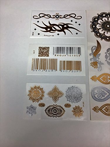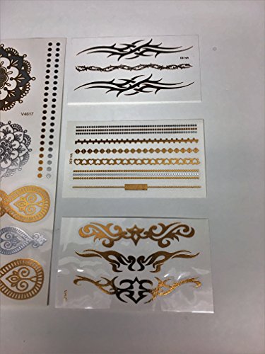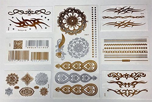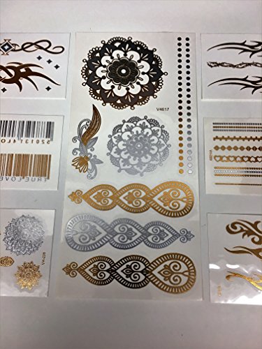 Metallic Temporary Fake Tattoos Tribal Blossoms Pack Long Lasting Premium 7 Sheets Beautiful Gold & Silver Shimmer Intricate Designs For Hand Wrist Neck Ankle Arm Women Teens Girls Flower Heart