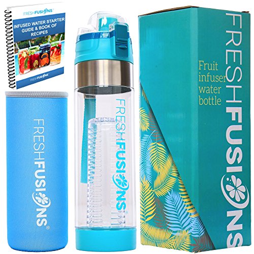 Fresh Fusions Fruit Infuser Water Bottle 24 oz - With Insulated Sleeve + Healthy Recipe Ebook - Includes 25 Infused Water Recipes