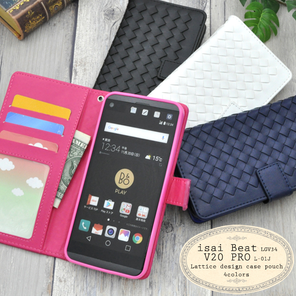 ラティス(格子)デザインのisai Beat LGV34/V20 PRO L-01J用レザーデザインケースポーチ。