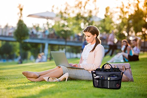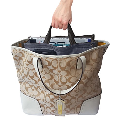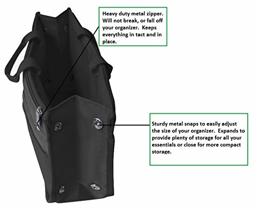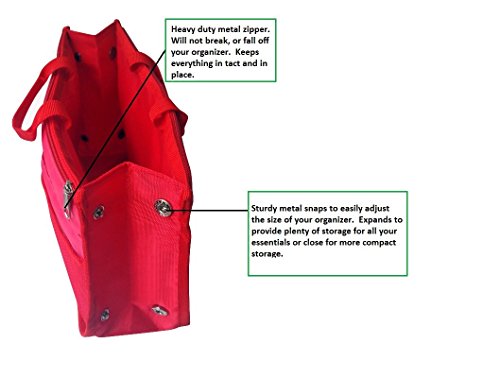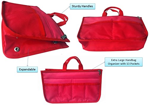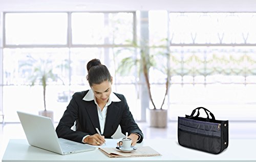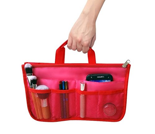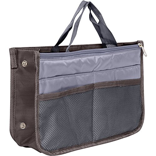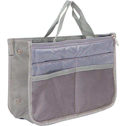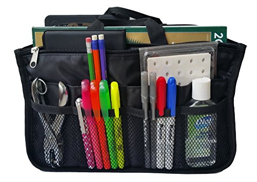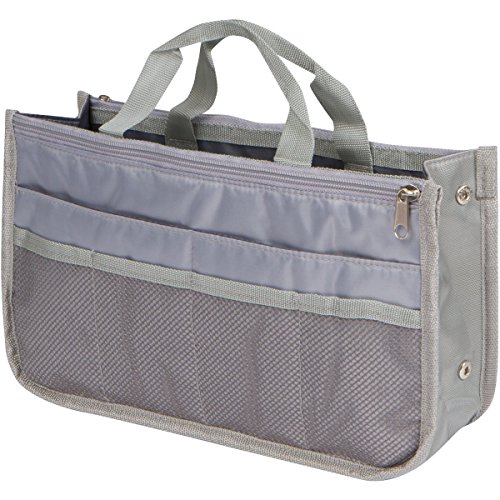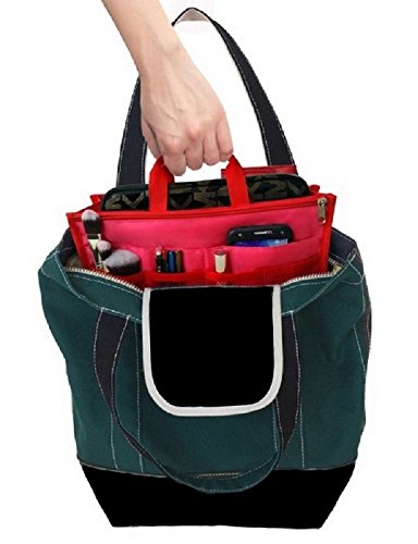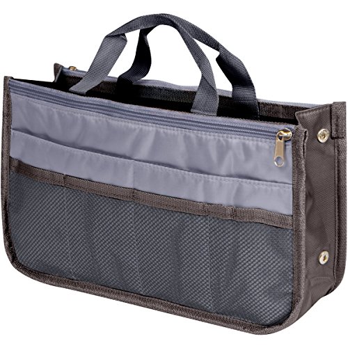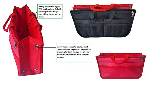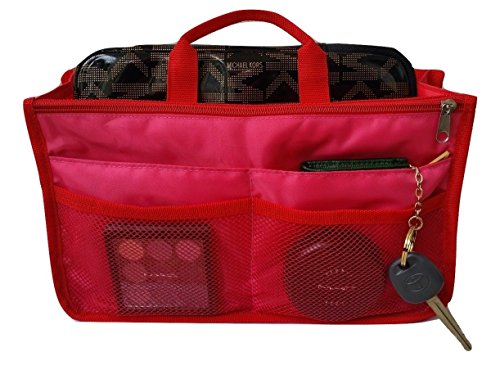 Product Description The RWC Portable handbag storage organizer, Purse insert, bag liner, travel organizer, keeps all of your essentials fully organized inside your satchel, tote, travel bag, suitcase, luggage, handbag, crossbody bag. Designed with thirteen pockets to offer plenty of storage and two sturdy straps to help you switch handbags with ease. This handy purse insert expands to maximize space in larger bags. Perfect to organize Mummy Handbag, baby diaper bag, baby stroller, backpack, gym bag, handbag of all types and sizes. Lots of space for makeup or cosmetics, toiletries, stationery, ipad, cell phone, laptop, books, magazines etc. No more searching through piles of stuff to find what you are looking for. Dimensions: 12.5" x 7.5" x 4 0