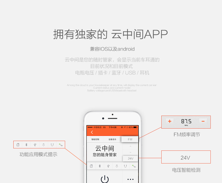 Download exclusive APP "clouds" FM and control on the car through the mobile phone can be used conveniently. Can also see the car battery voltage. Cloud in the middle of your butler.
