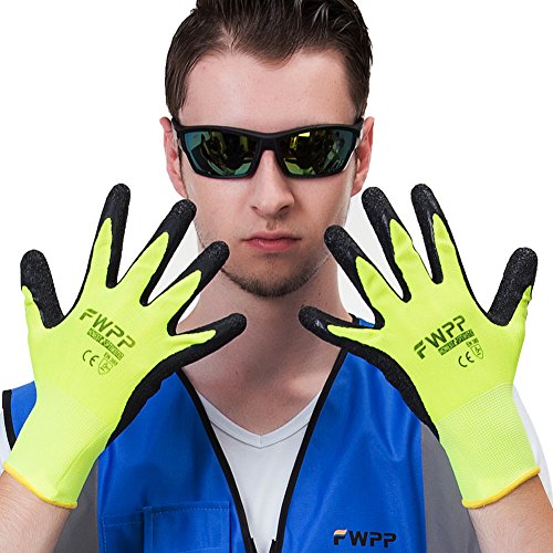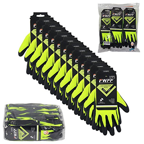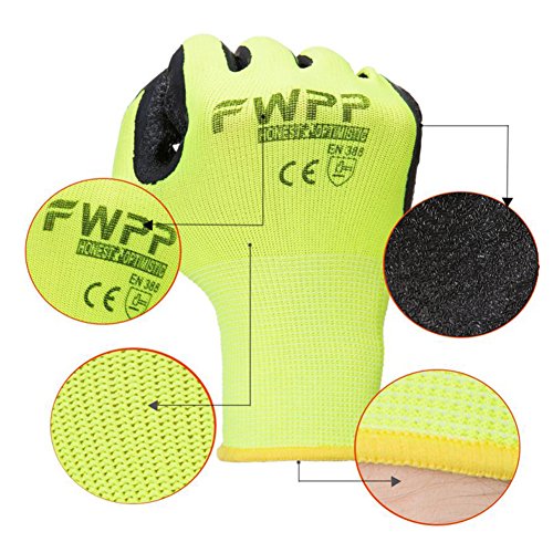 FWPP High Visibility Latex Coated Work Gloves,Pack of 6Pairs Medium, Double Textured Wrinkle Nylon Garden Gloves for Men and Women, Breathable Soft Light Weight, Yellow