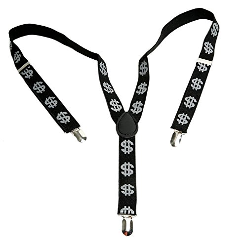 Studio : Funny Fashion Publisher : Funny Fashion Binding : Toy Product Description Flash Your Cash. Show your bling with Dollar Sign Suspenders! These black and silver suspenders are the perfect addition to your look during pimp daddy parties, sugar mama costumes, and casino night events. Accessorize with cash money pieces for a look friends and family will love! Adjustable suspenders, one size fits most. Money sign suspenders are approximately 1. Clip on suspenders. Silver accents. Be the star of the show, no matter what the event. Stock up on must have costumes and accessories for a silly and fun night to remember! 0