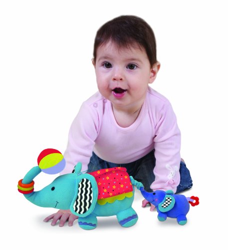 Soft, really cute and extra cuddly, these Elephants are full of discovery. As Baby/Toddler plays with them, surprises are revealed everywhere, including crinkly ears, squeaking balance ball, a discoverable baby safe mirror & hidden 'roller ball' spinning rattle under the saddle. Parent and child elephants are meant to stay together: when baby is pulled away, the parents tail pulls the baby back and vibrates for added excitement & fun! Encourages curiosity and hours of sensory play.Feature