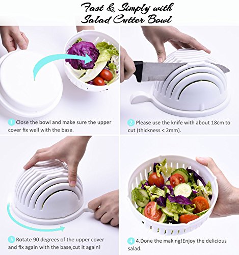 ★ EASY TO USE AND CLEAN- ✓Put your vegetable 's and fruit 's to Salad Cutter Bowl; ✓Wash your salad ingredients, you can do this with the bowl or separately at your discretion; ✓Connect two pieces together and to slice using a knife. It is very simple as 1-2-3 and fast. After cooking, rinse the device under running water.