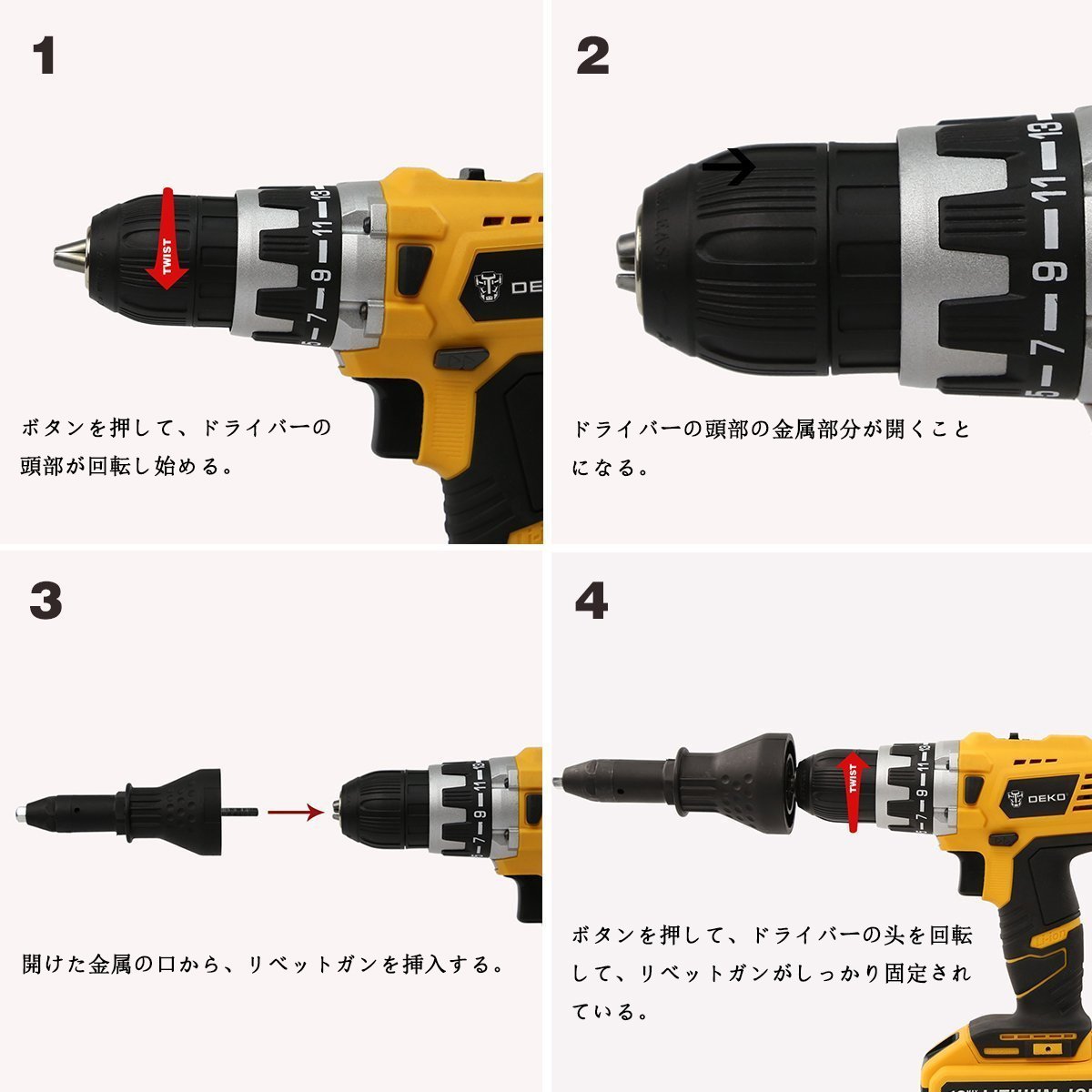 With this drill, you can easily drill, pull rivets, spin twist and so on.