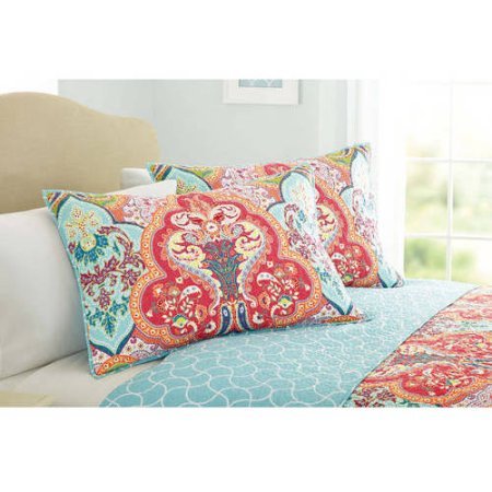 Studio : Better Homes and Gardens Publisher : Better Homes and Gardens Product Description Brighten up your room with this beautiful jeweled toned reversible quilt. The damask design features bright hues with a calming reverse. Its exterior is a soft blend of durable and fade resistant polyester with a cotton blend fill that allows it to be safely machine washed. The fabric is made with 100 percent polyester, and the fill contains comfortable and soft cotton. The Better Homes and Gardens Jeweled Damask quilt is available in three sizes, twin, full/queen or king. Better Homes and Gardens Jeweled Damask Bedding Quilt Collection: Soft and reversible, Fabric Content: Polyester, Fill Content: Cotton/Other, Care instructions: machine washable, Twin: 90" x 90" (228.6 cm x 228.6 cm), Full/Queen: 90" x 90" (228.6 cm x 228.6 cm), King: 104" x 92" (264.2 cm x 233.7 cm), Standard sham size: 20" x 28" (50.8 cm x 71.1 cm), Directions: Fabric Care Instructions: Machine Washable. 0