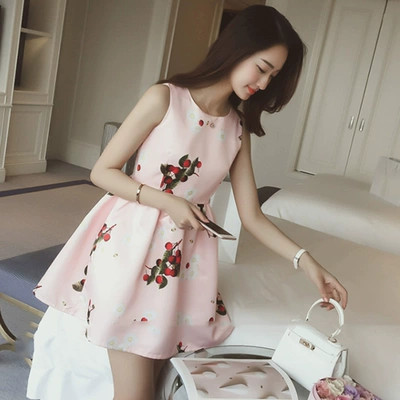 新款韩范甜美气质修身显瘦樱桃印花无袖背心连衣裙短裙女