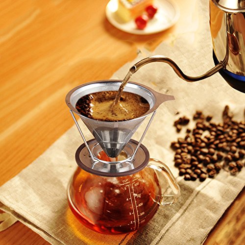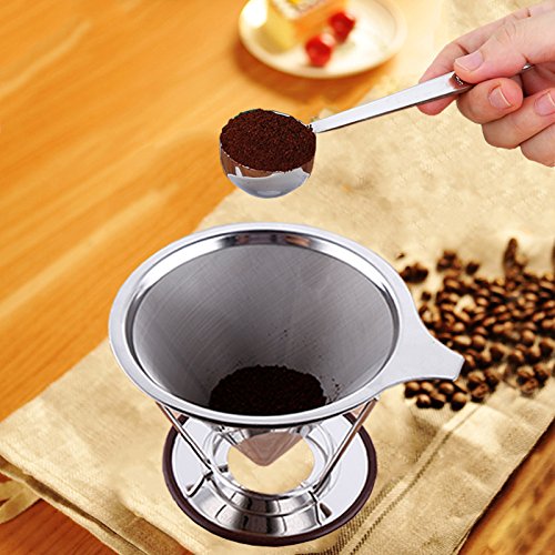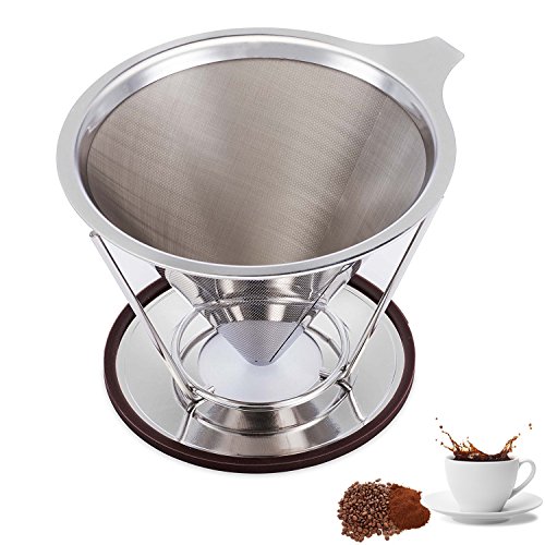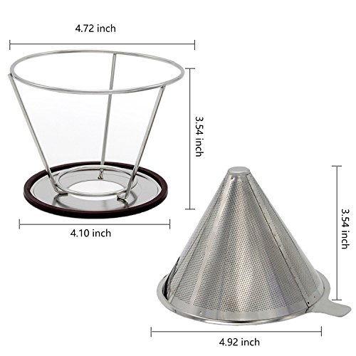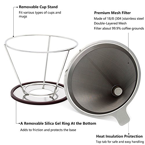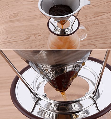 Coffee Dripper Stainless Steel Coffee Filter Pour Over Permanent Paperless Reusable Dual Filtration Coffee Cone with Cup Holder Stand for Home Office Coffee Maker Brewer 4-6 Cups