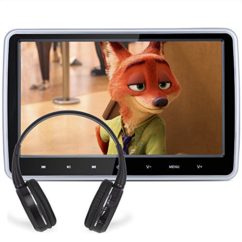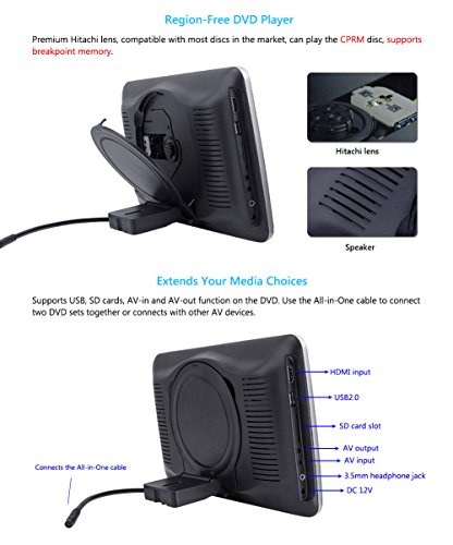 -. Feature : 10.1" TFT LCD Screen (Hitachi lens) with touch keys (Not touchscreen). Display Mode: 16:9 wide view angle / Removable Design for both in-car &home use and two Mounting Bracket provided to compatible with more car modes / DVD region: compatible with DVD/VCD/MP4/RMVB/CD-R/CD-RW/SVCD/DIVX/CPRM,. Built-in 2.0 USB port/SD/MMC card slot/IR/FM/Speaker/HDMI Input Port, and Built-in 32 bits wireless games Function, with Game Disc / If you buy 2 of them, the headrests can play the same games or the same movies when you connect them together by AV input and output cable, otherwise they will work separately / HDMI function enable the headrest DVD synchronized playing video and audio with your computer, mobile phone, raspberry pie, kindle fire .etc