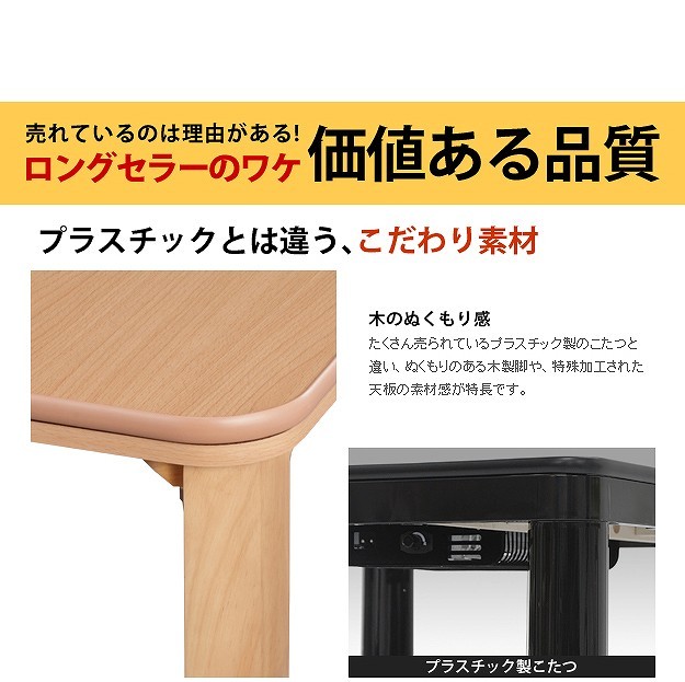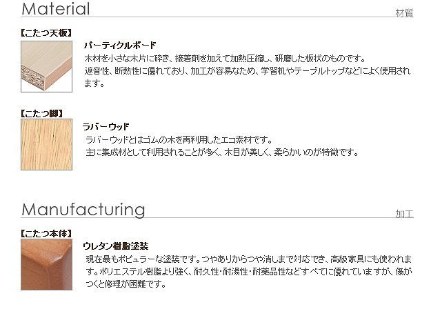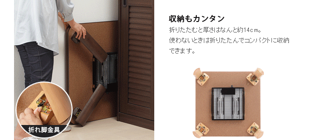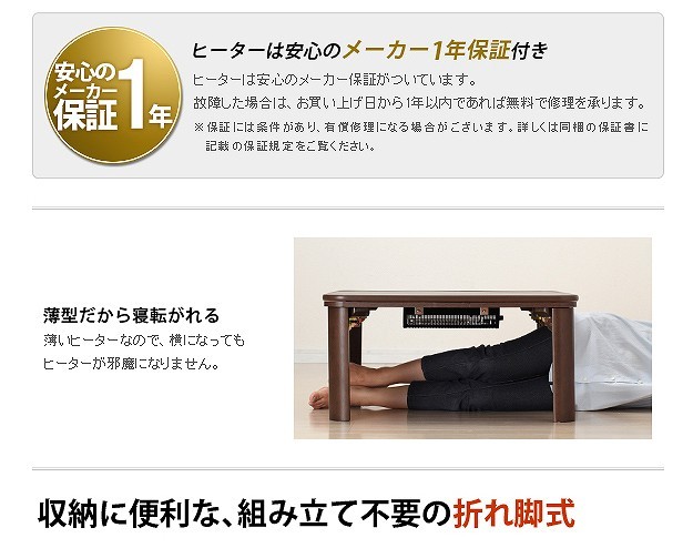 商品について:木製こたつ+省スペース布団の2点セット。1人暮しに最適♪天板は表も裏も使えるリバーシブル仕様。メラミン加工を施しているので、水や汚れに強いだけでなく、熱や傷にも強いのが特徴です。折りたたむと厚さ約14cm。使わない時はコンパクトに収納できます。
