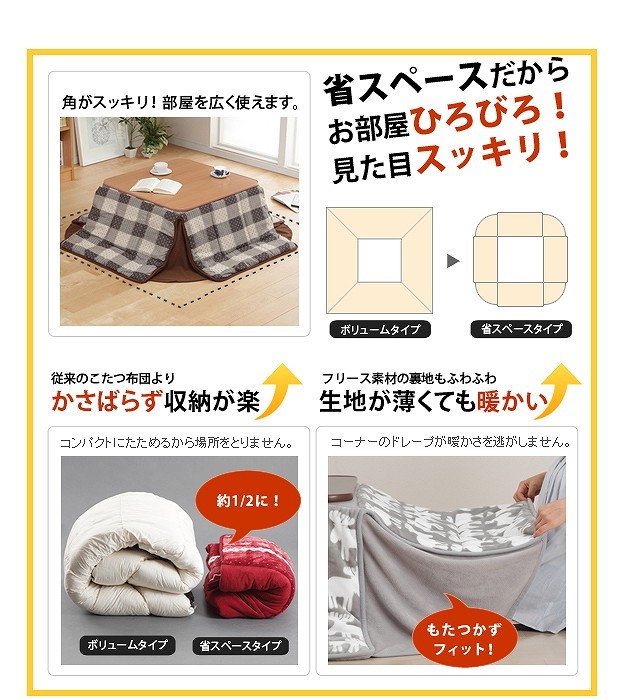 セットのこたつ布団は角のもたつきを解消した省スペースタイプ。圧迫感のないスッキリとした印象☆裏地とコーナー部分は保温性の高いフリース素材です。