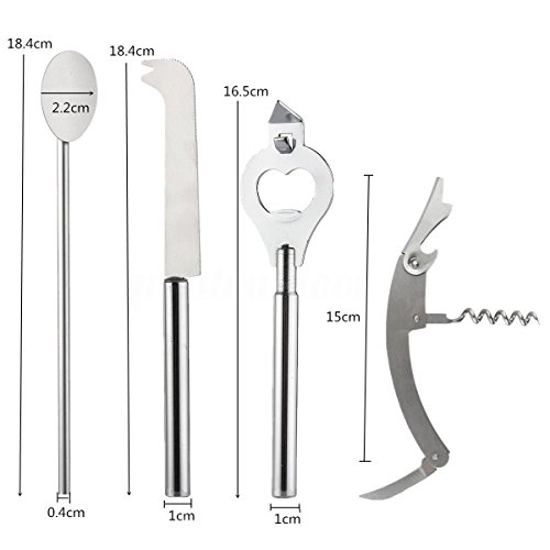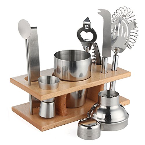-. Title : 9 PCS Stainless Steel Cocktail Shaker Mixer Drink Bartender Martini Tools Shaker Double Jigger Lemon Knife Strainer Bottle Opener Stirrer Tongs Wood Stand Bar Kit