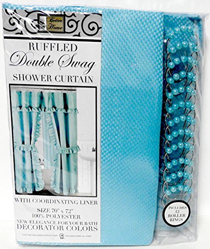 Double Swag Fabric Shower Curtain with Vinyl Liner and 12 Roller Shower Rings (Turquoise)