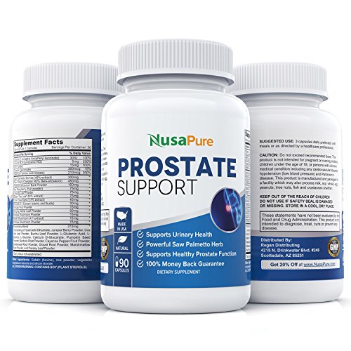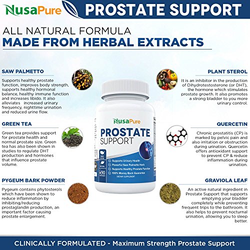 -. Feature : PROSTATE SUPPLEMENT WITH SAW PALMETTO - Powerful, herbal formula with B Complex, Red Raspberry Leaf, Stinging Nettle and more helps keep and maintain Best Prostate Health for Men / ALL NATURAL, SAFE PROSTATE FORMULA - Made in the USA with all natural herbs: Coupled with B Complex, Red Raspberry Leaf, and Nettle Root, Saw Palmetto berries in Prostate Support naturally contain BETA SITOSTEROL, which has been shown to support prostate health. / FEELING LIKE YOU HAVE TO GO ALL THE TIME? You don't have to! NusaPure has formulated a powerful formula consisting of 16 powerful ingredients including Saw Palmetto, Green Tea, Plant Sterol, Graviola Leaf and more! These powerful ingredients combat the side effects of an enlarged prostate allowing you to get relief from all of those pesky, negative symp / FIGHT HAIR LOSS - Saw Palmetto Berries may block 5-alpha-reductase - an enzyme that converts testosterone to DHT. DHT has been shown to be the main cause of genetic hair loss, (male pattern baldness). DHT has been linked to baldness in men and women / 100% LIFETIME RISK-FREE GUARANTEE - Try Prostate Support completely risk free. If you are unsatisfied with the results of Prostate Support, you can get a complete refund. Click Add to Cart to get results now