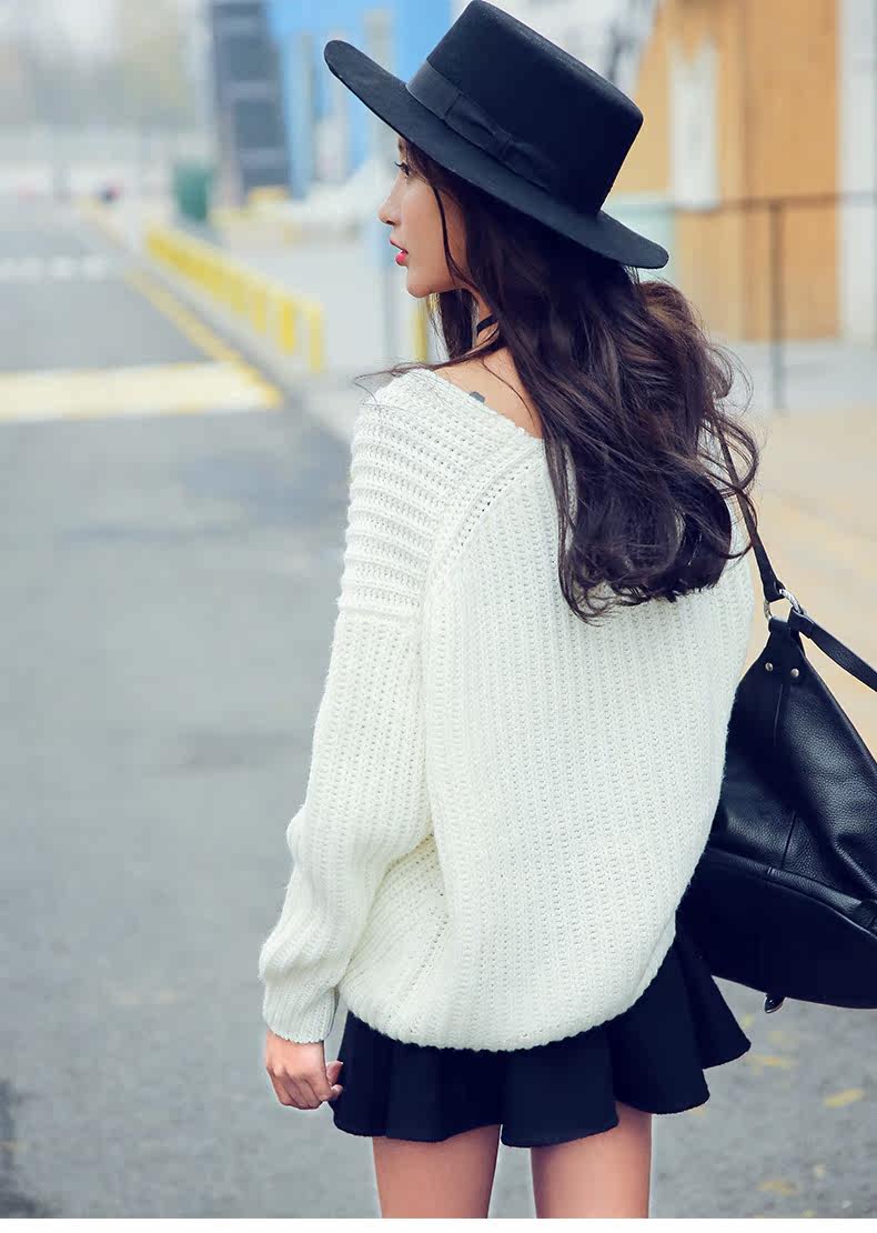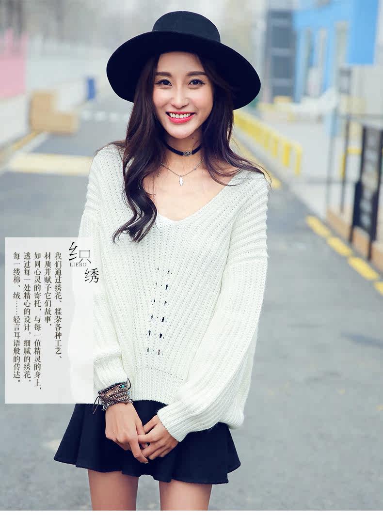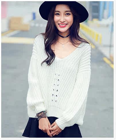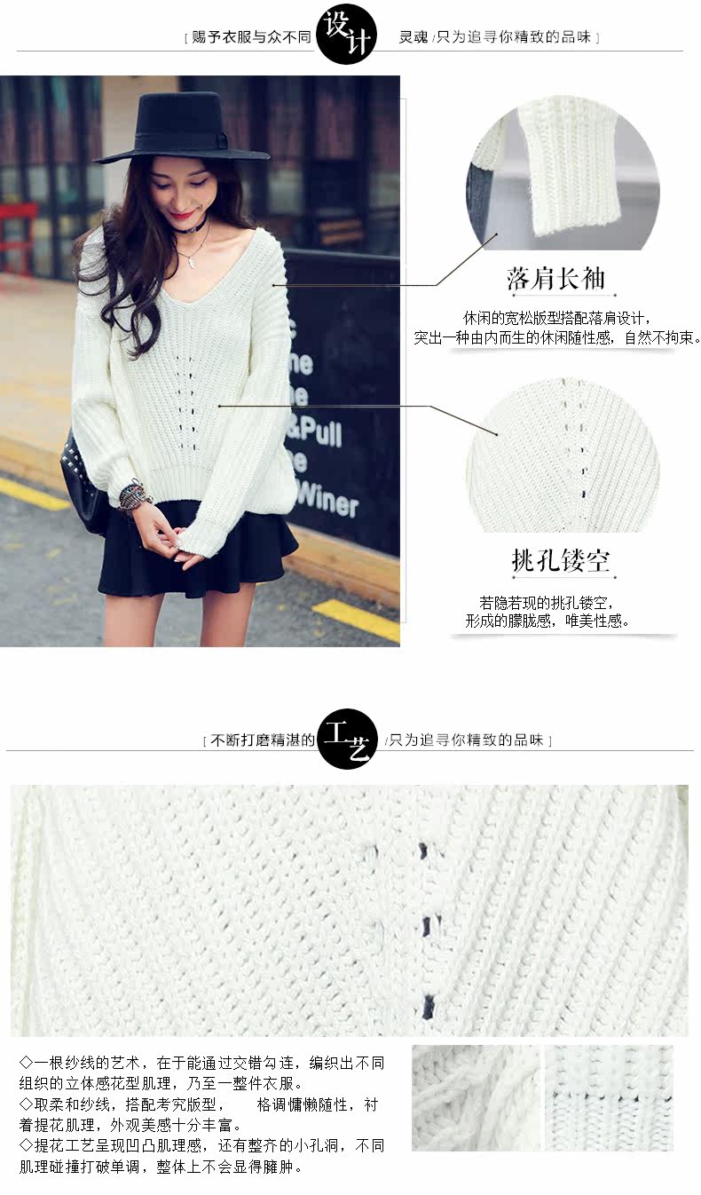 V领落肩袖镂空宽松毛衣