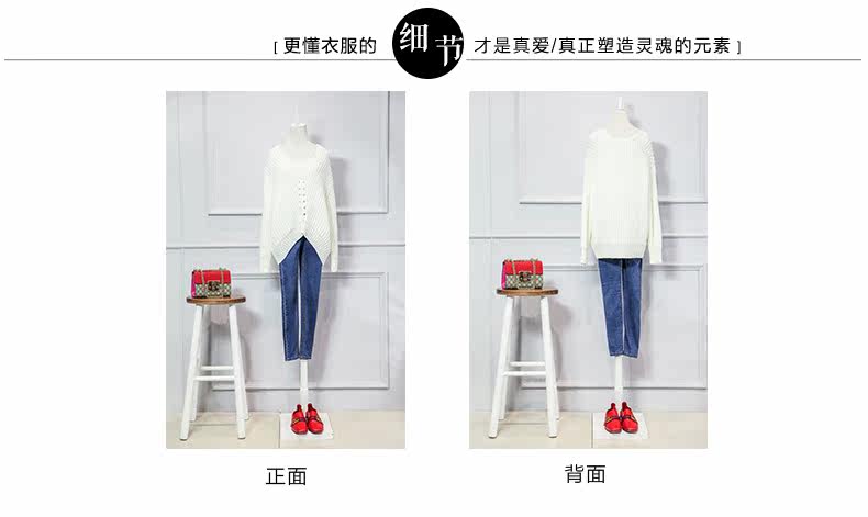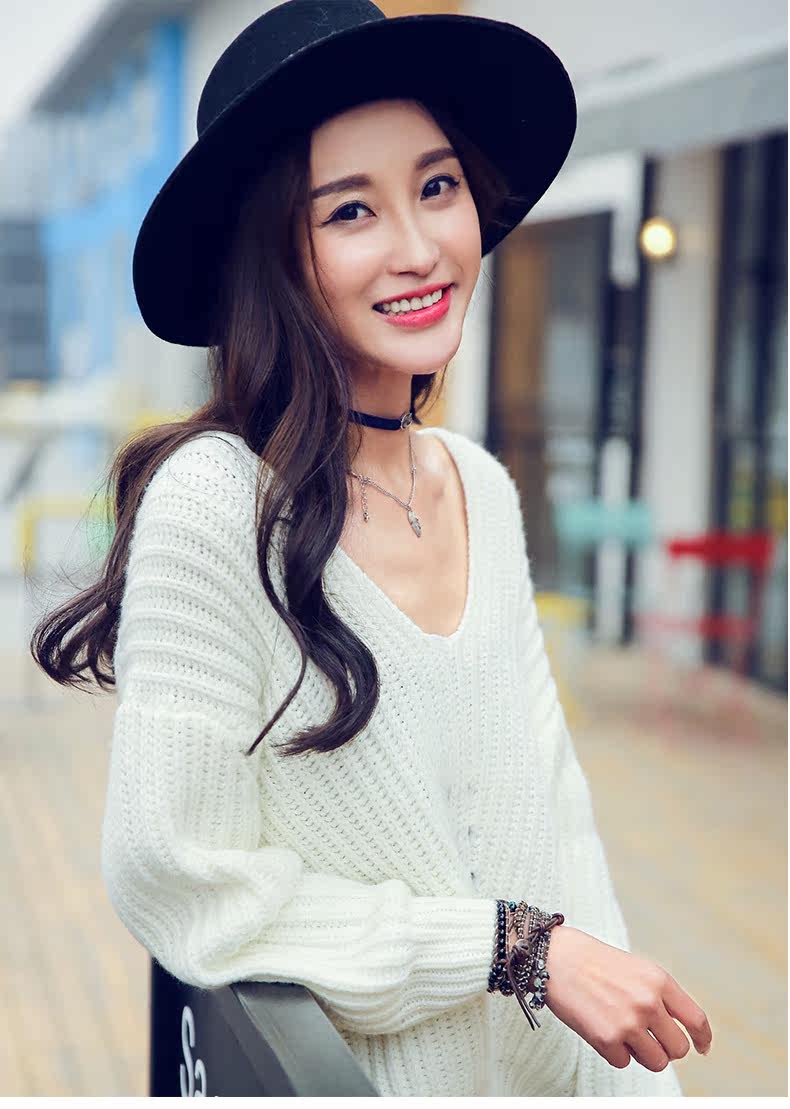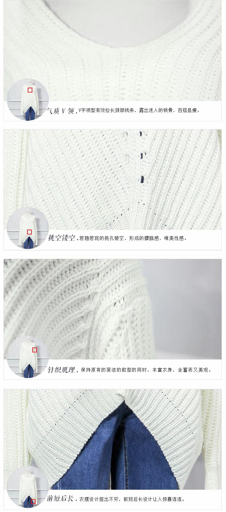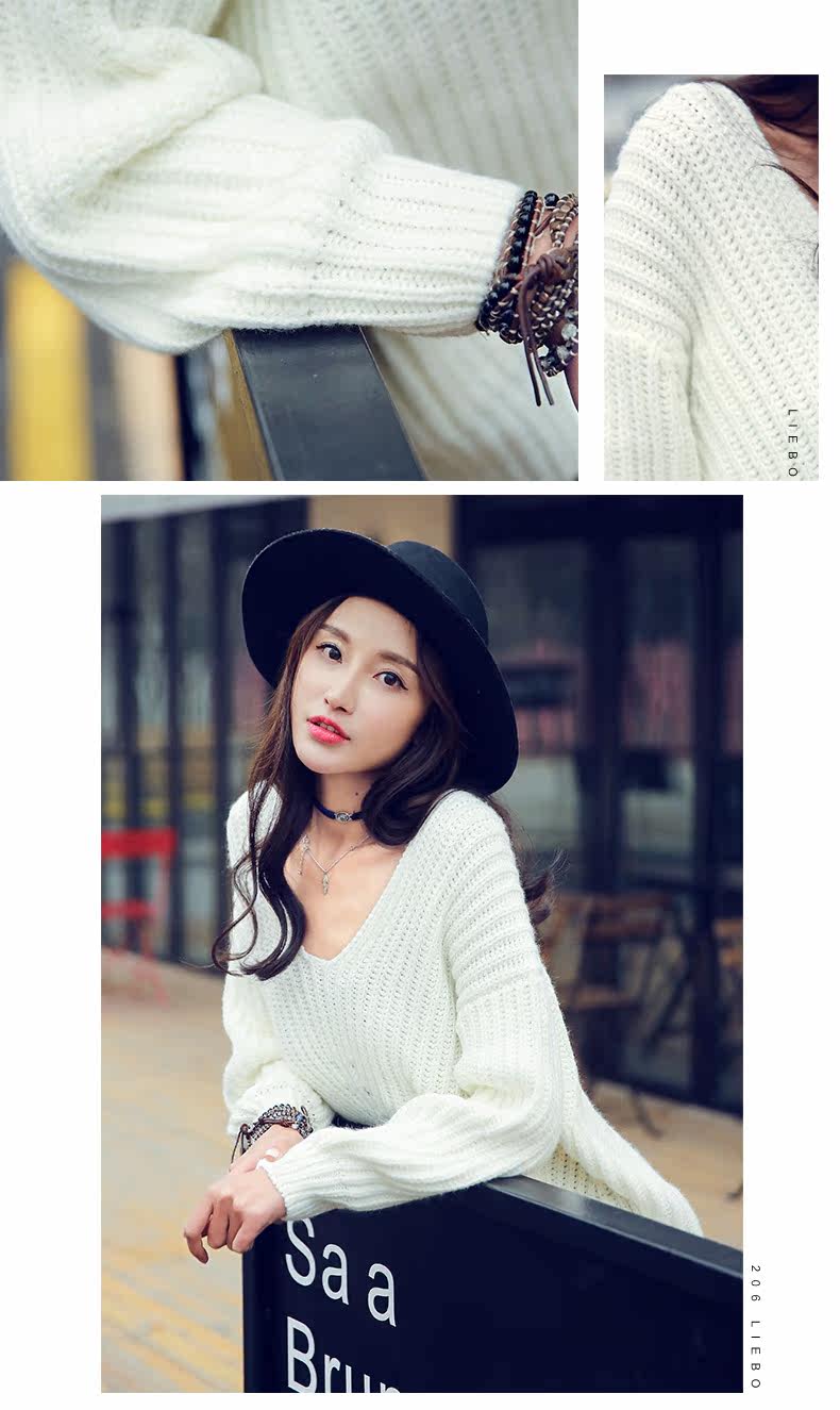 V领落肩袖镂空宽松毛衣
