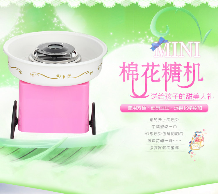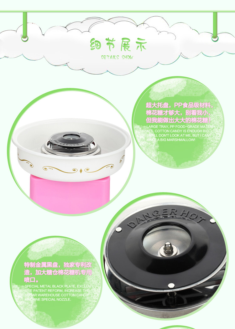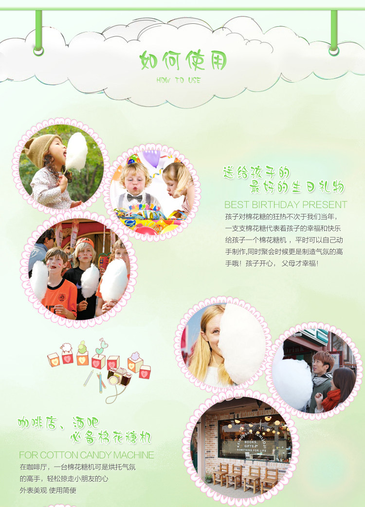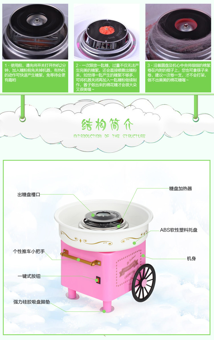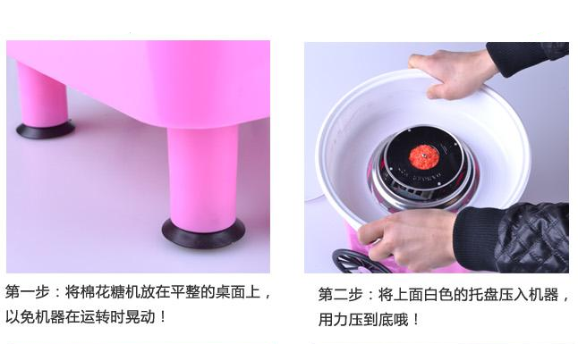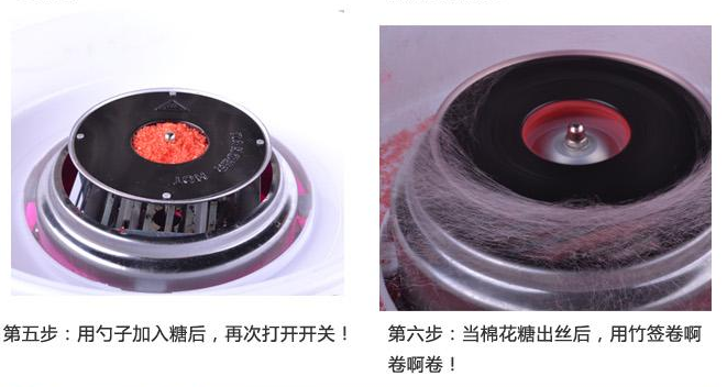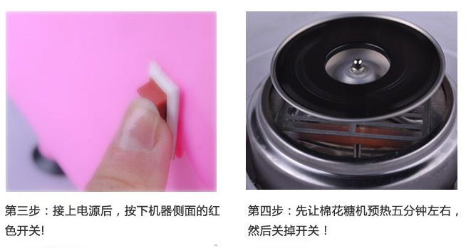 使用前,请先将开关打开热机2分钟,加入糖粉前先关掉机器,有热机的动作可快速产生糖絮,免等待会更有趣哟