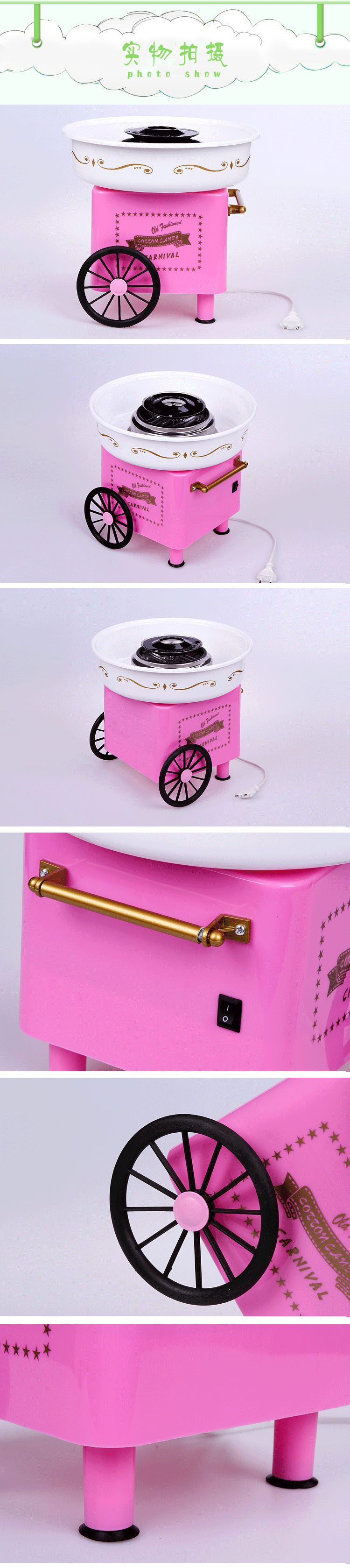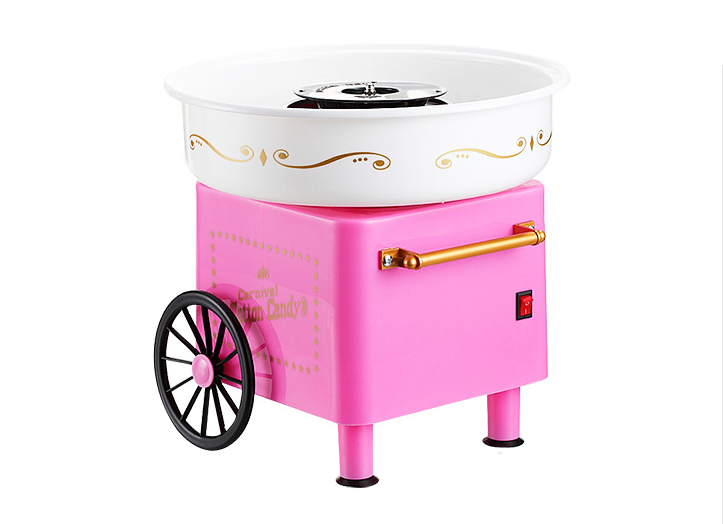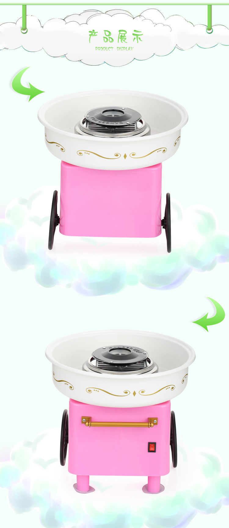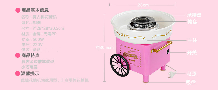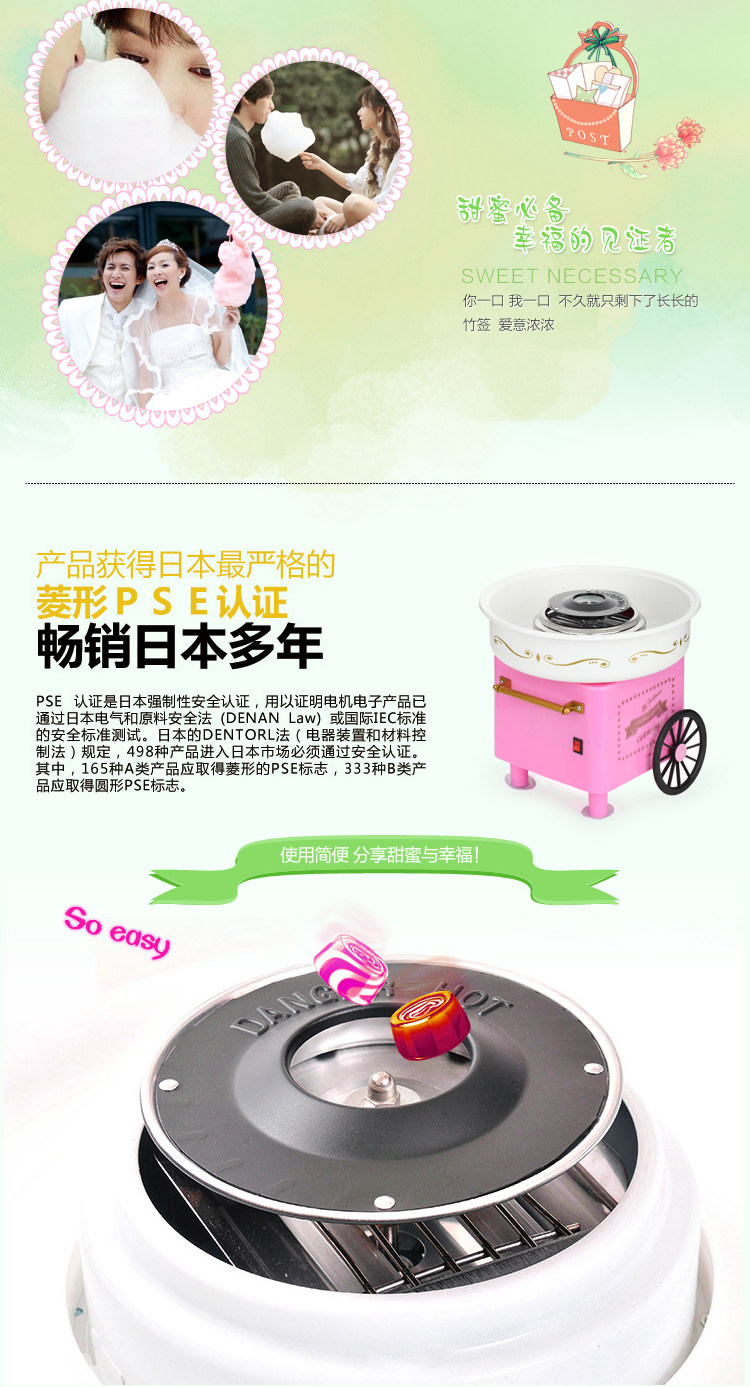 使用前,请先将开关打开热机2分钟,加入糖粉前先关掉机器,有热机的动作可快速产生糖絮,免等待会更有趣哟