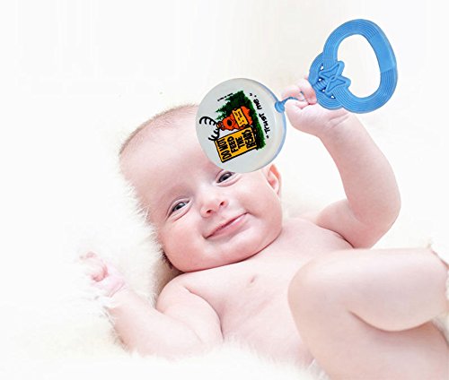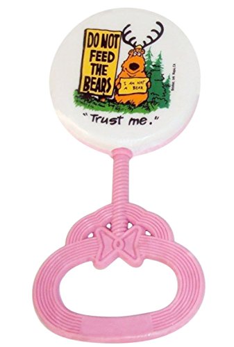 The picture shows a bear wearing antlers and holding a sign that says "I Am Not A Bear" while standing next to a very large sign that says (in capital letters) "DO NOT FEED THE BEARS". It has graphics on one side of the rattle head and a solid pastel color on the other side. Rattles measure approximately 5"L x 2 1/2"W x 1/2"D.Feature