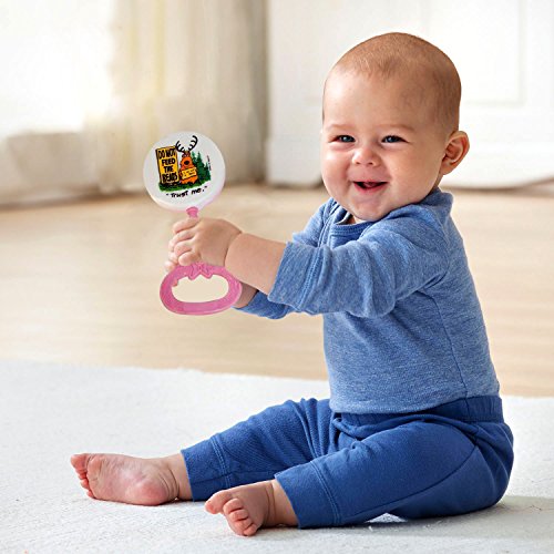 PLASTIC BABY RATTLE : The picture shows a bear wearing antlers and holding a sign that says "I Am Not A Bear".