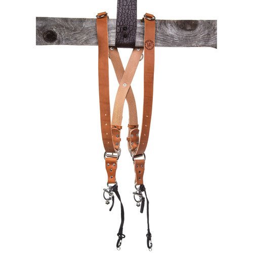 HoldFast Gear MoneyMaker Two-Camera Harness without D Rings on Shoulders, Bridle Leather, Medium, Tan