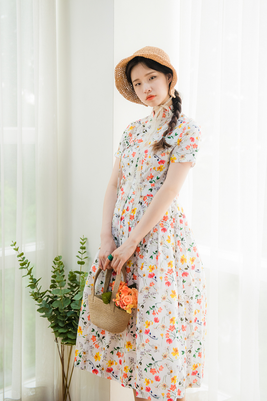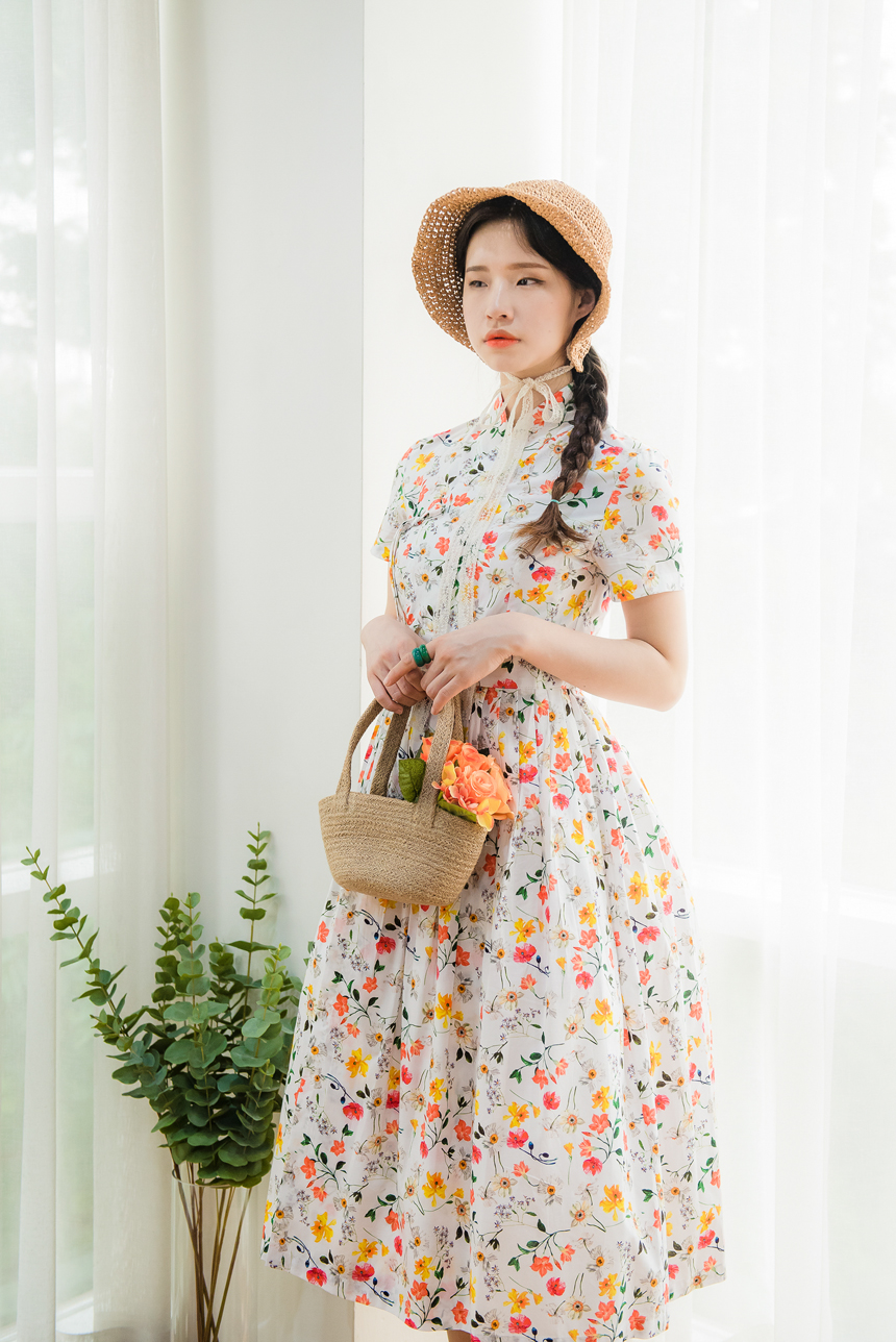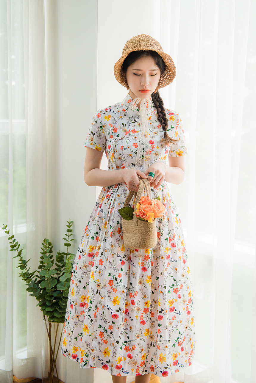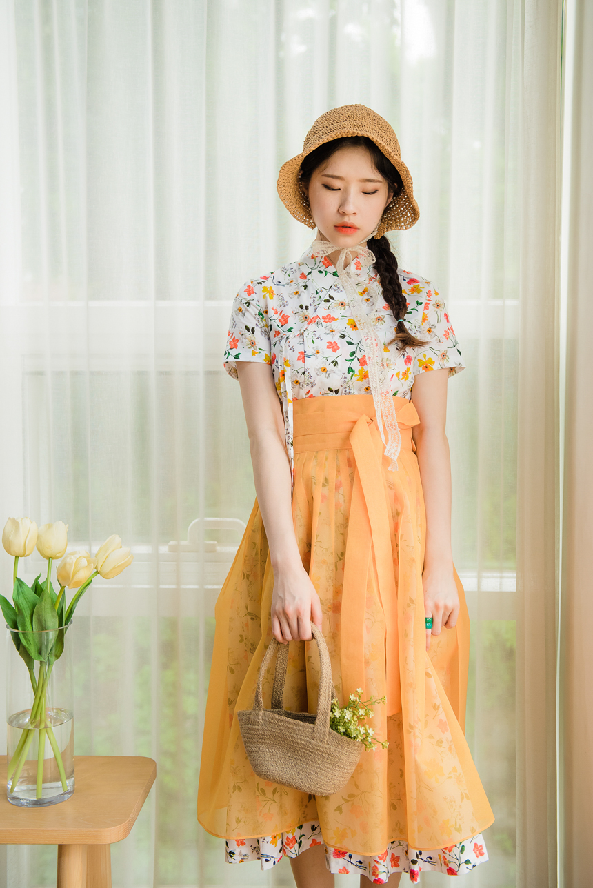 깨끗한 화이트빛 바탕에 노랑색,주홍색 꽃과 초록잎이 산뜻하게 그려져있는 철릭원피스로