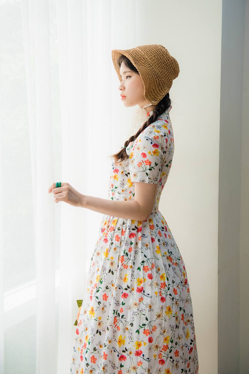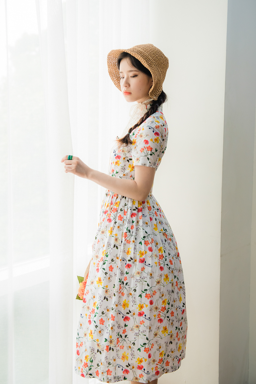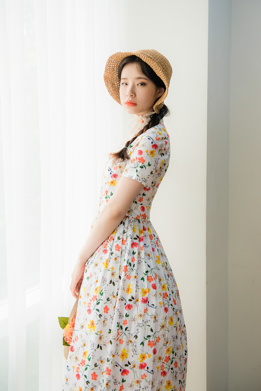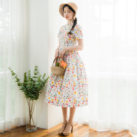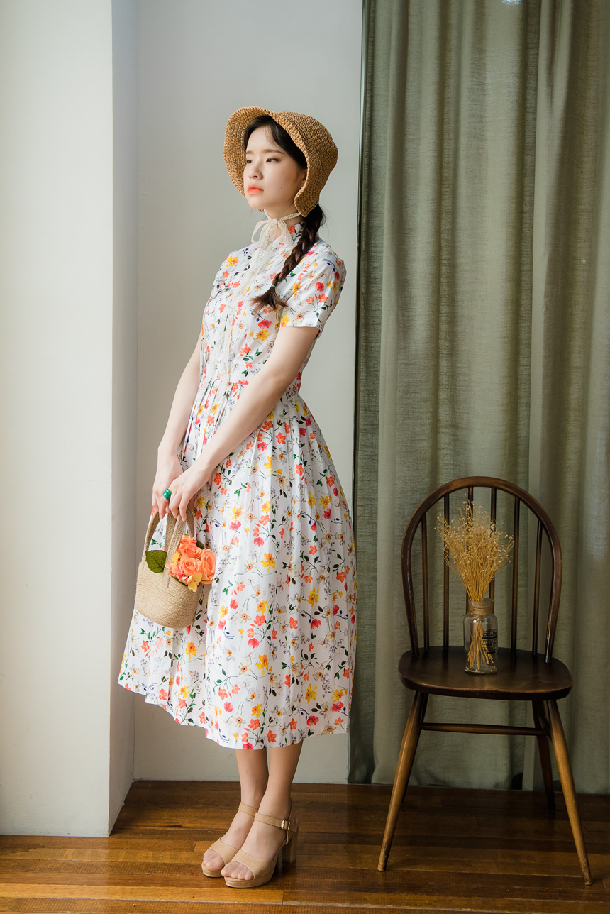 깨끗한 화이트빛 바탕에 노랑색,주홍색 꽃과 초록잎이 산뜻하게 그려져있는 철릭원피스로