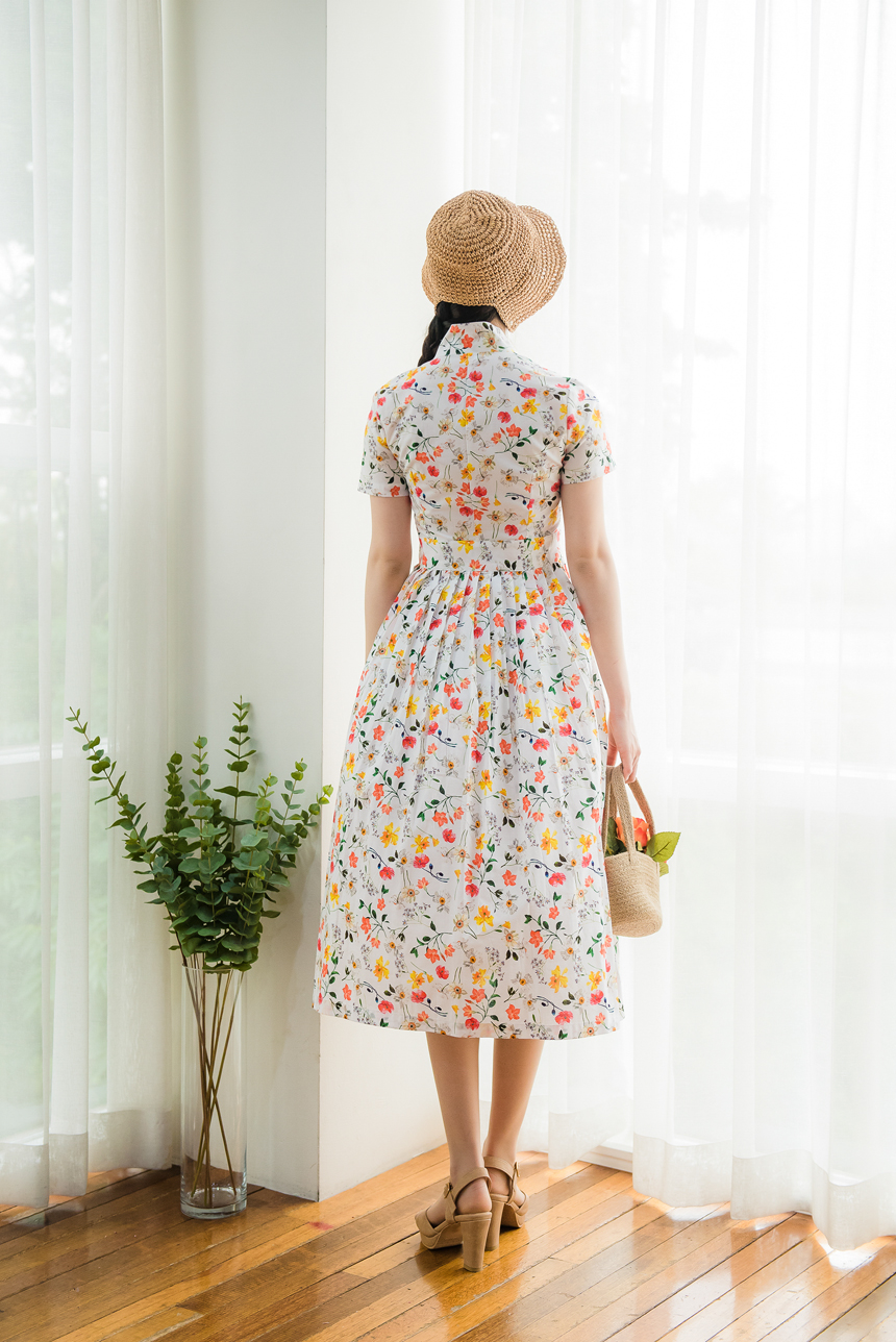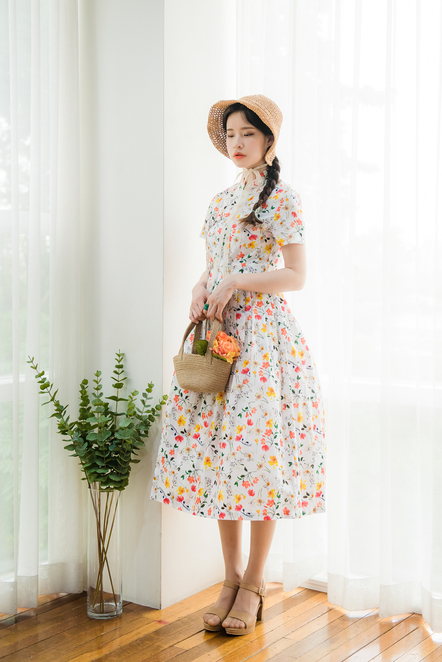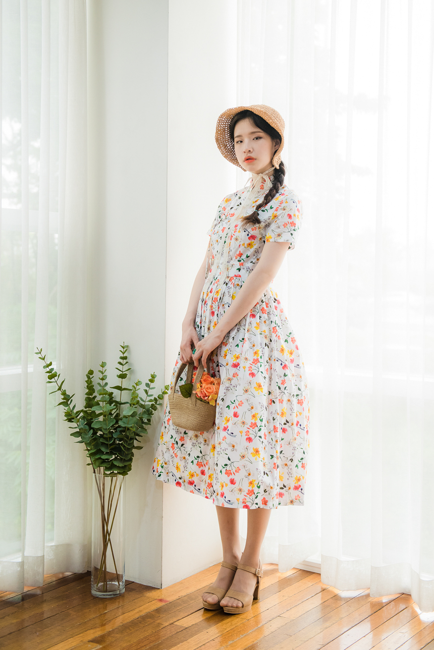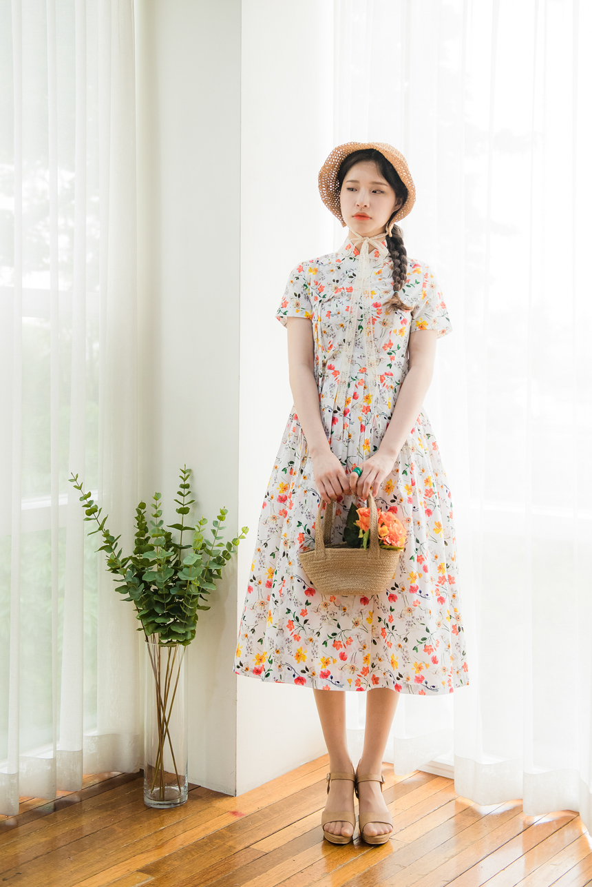 깨끗한 화이트빛 바탕에 노랑색,주홍색 꽃과 초록잎이 산뜻하게 그려져있는 철릭원피스로