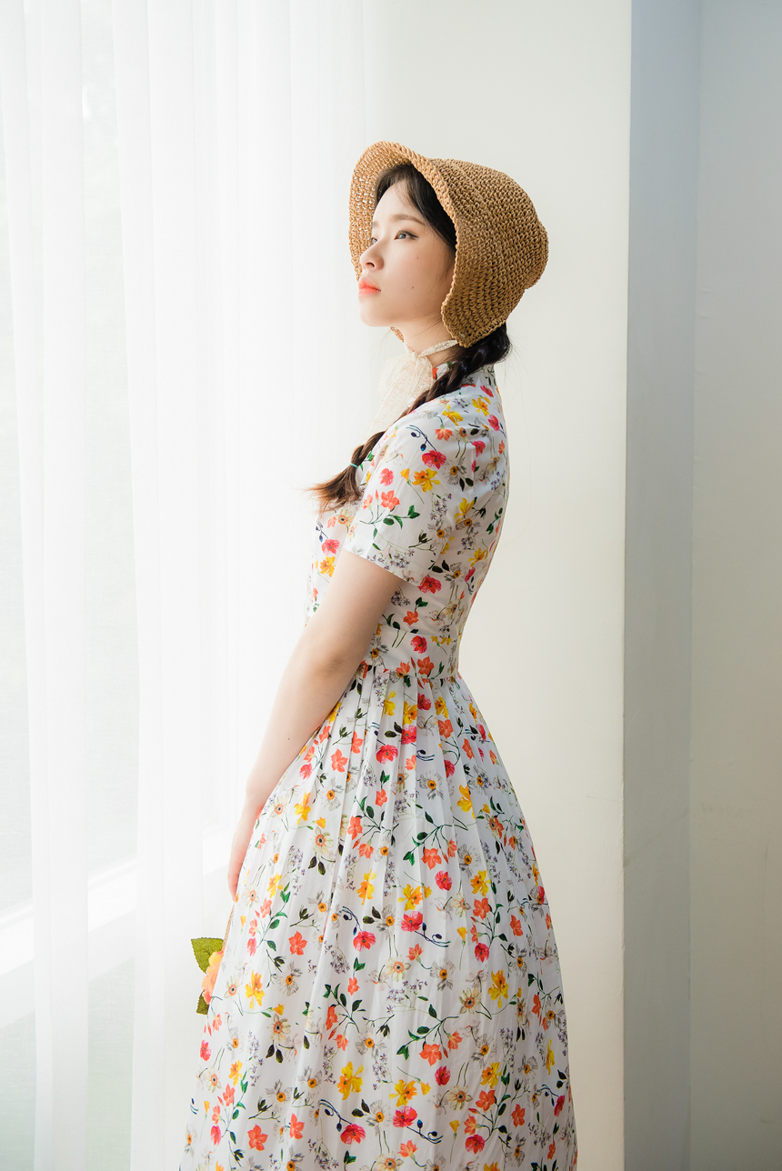 꽃닮의 시그니처 디자인인 시스루 허리치마는 사뿐사뿐 움직이실때마다 원피스의 꽃무늬가 살짝살짝 보이며