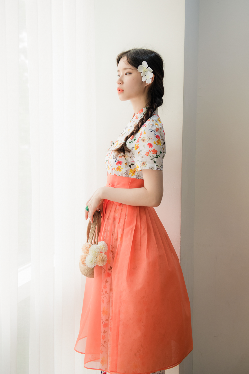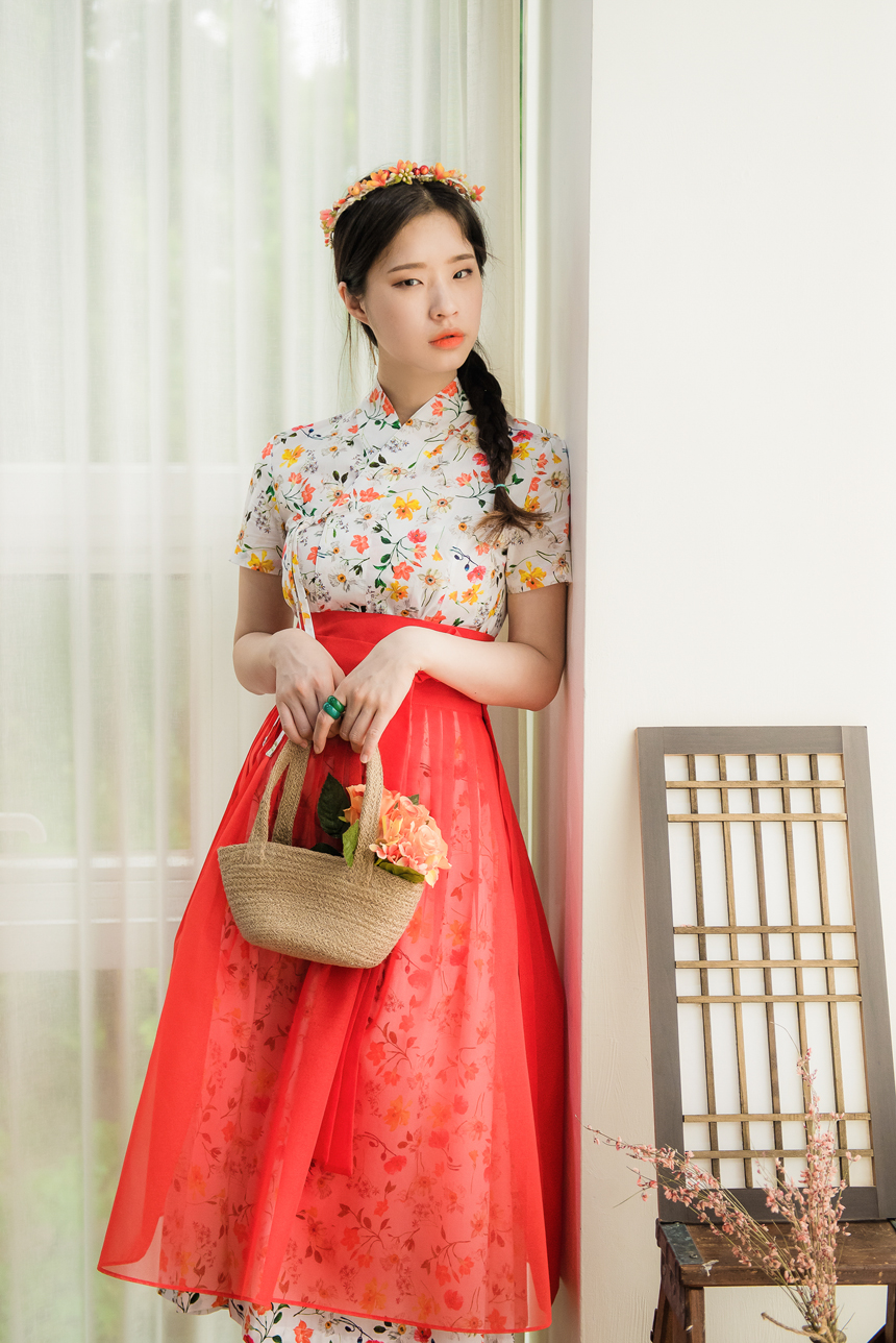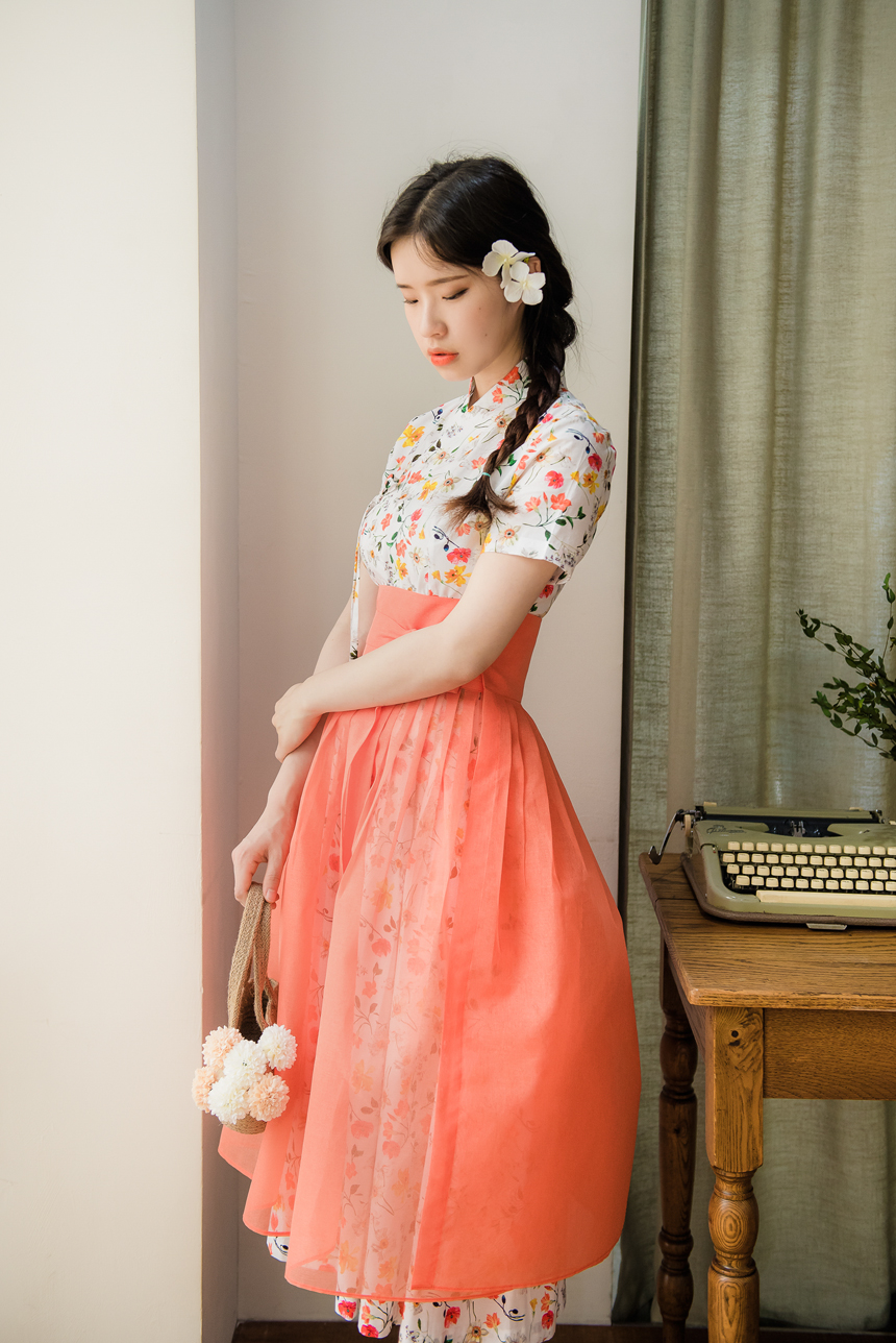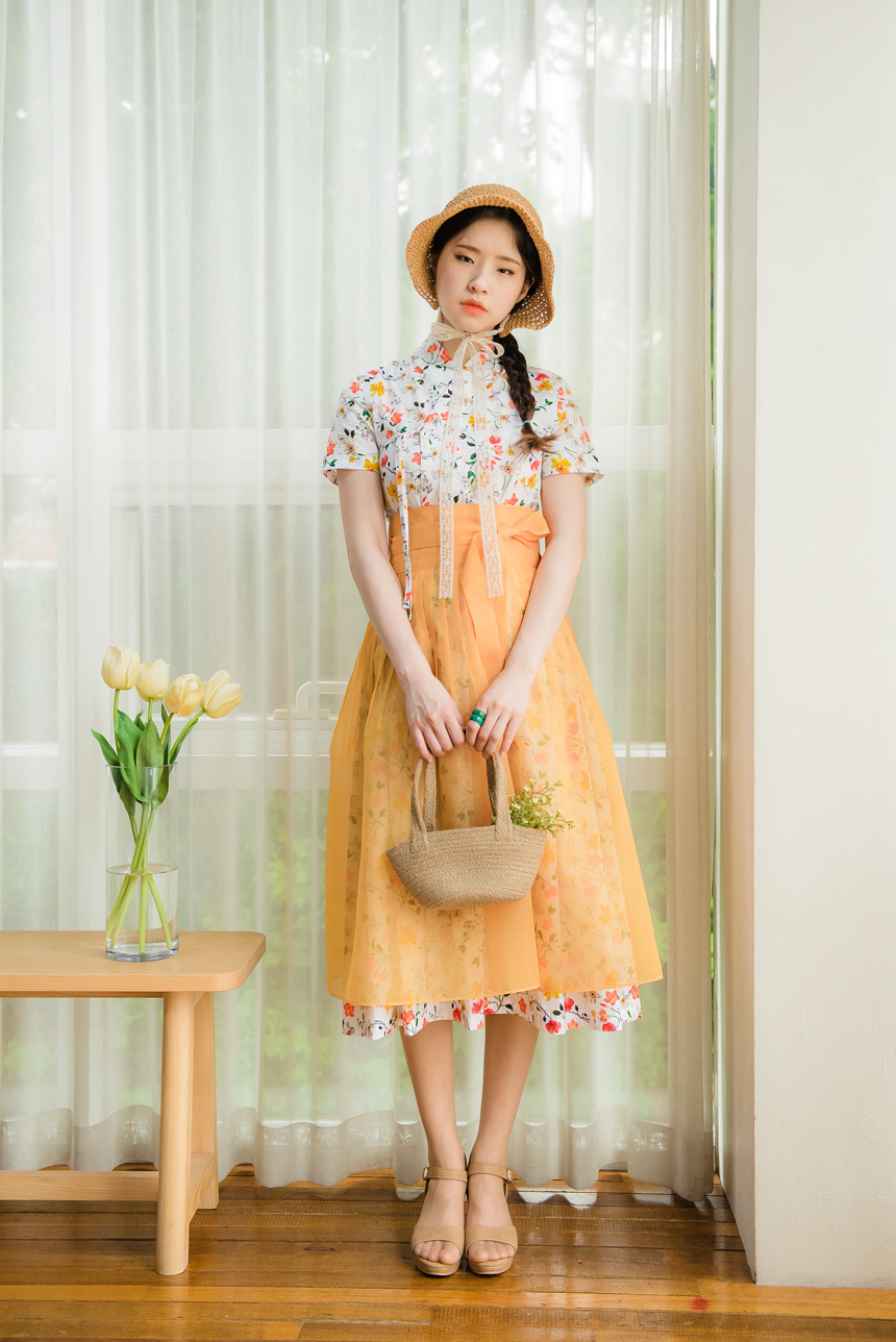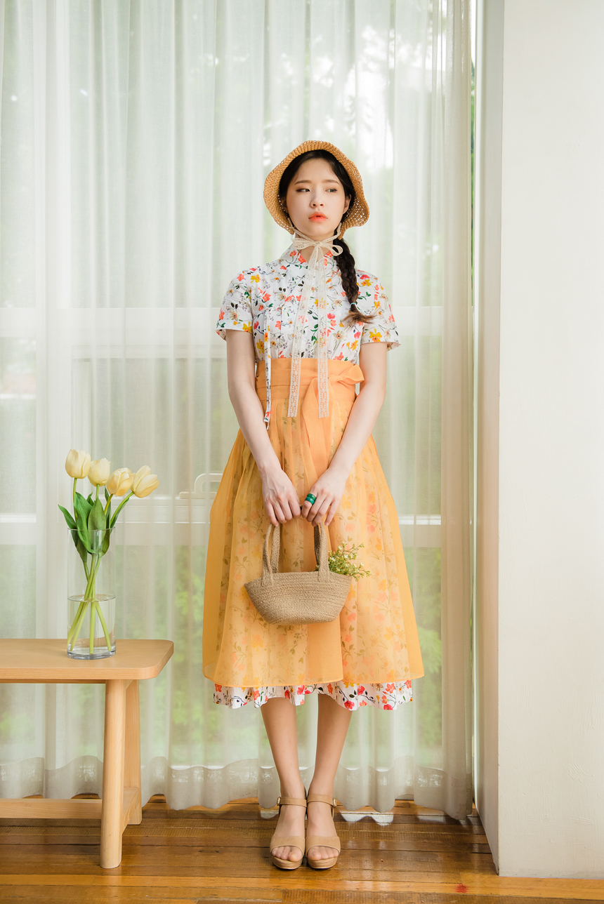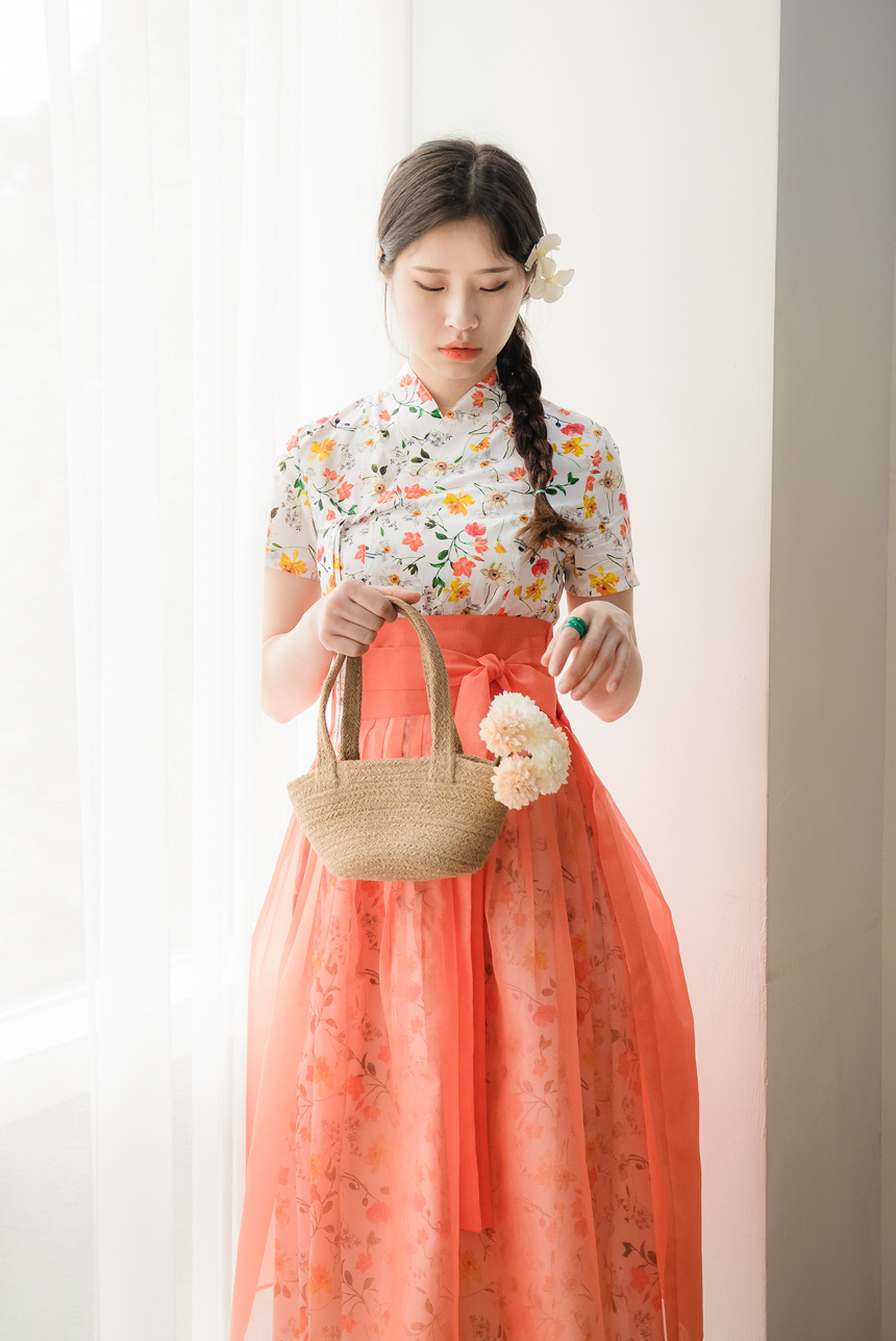 시스루 덧치마와 함께 코디하시면 원피스의 꽃무늬가 살짝씩 보이는 청초하고 신비로운 한복룩을 완성하실수 있답니다.