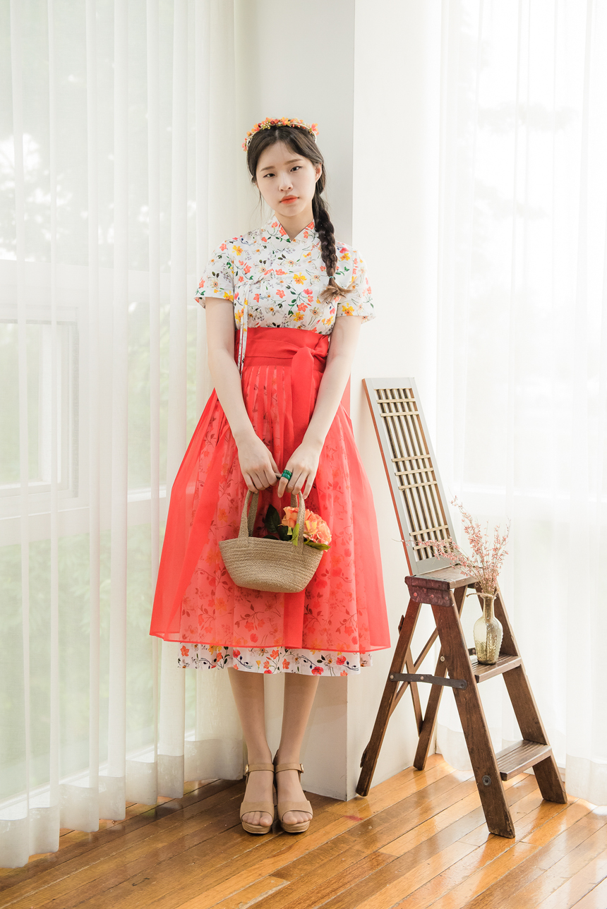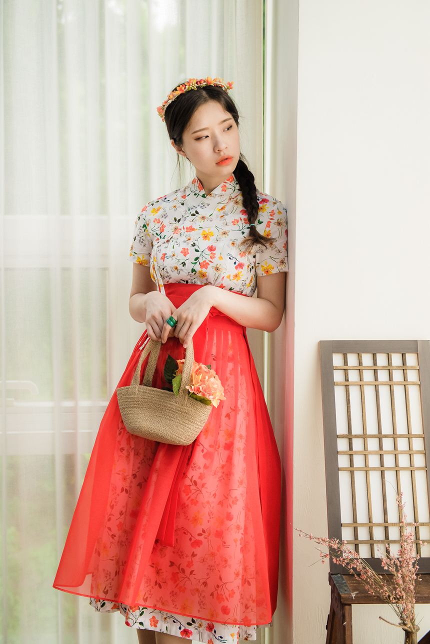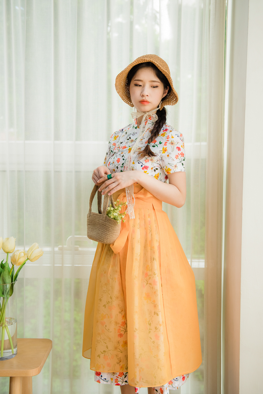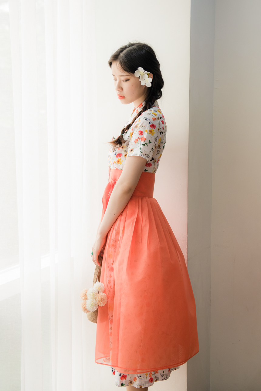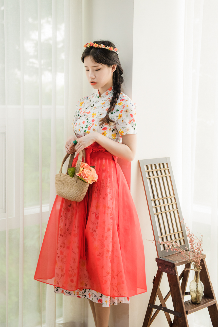 시스루 덧치마와 함께 코디하시면 원피스의 꽃무늬가 살짝씩 보이는 청초하고 신비로운 한복룩을 완성하실수 있답니다.