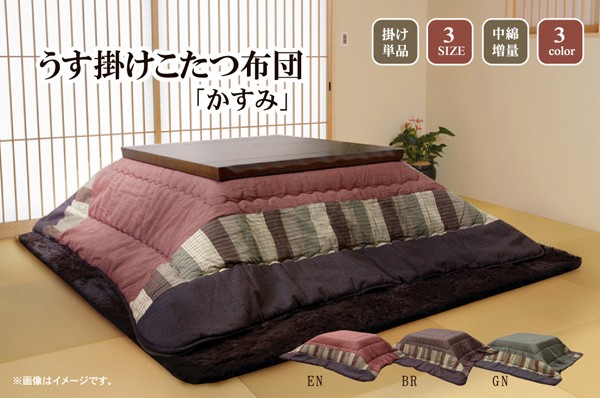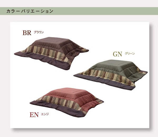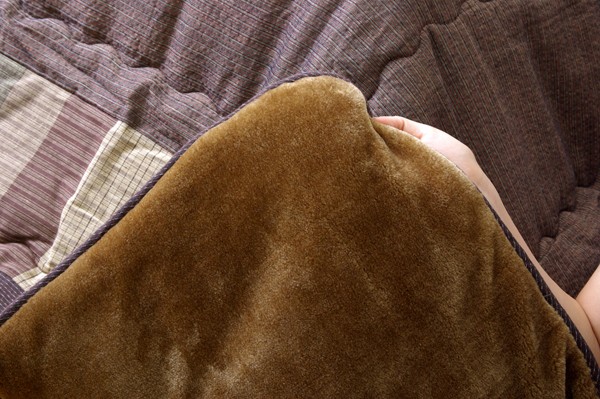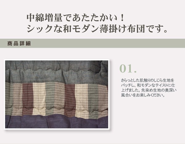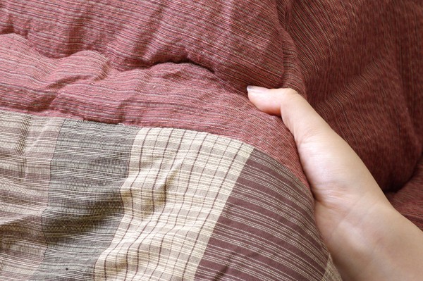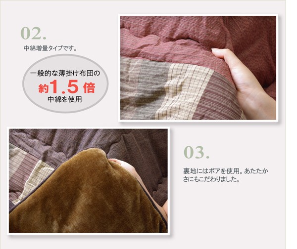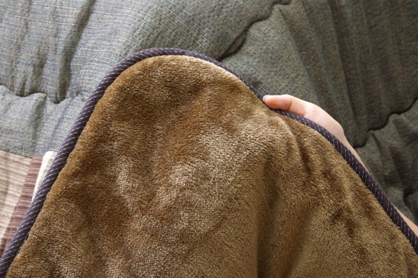 べとつかず肌触りの良い、しじら織のモダンな和風こたつ布団です。一番広い無地調の部分は複数の繊細な色使いで深みのある色を出しています。その外側はパッチワーク風、額部分は刺子調で仕上げており、3パターンの織りをお楽しみ頂ける商品です。肌に直接触れる裏地部分にはボアを使用し、暖かさにもこだわりました。さらに通常の薄掛こたつ布団よりも中綿を増量して保温性にもこだわりました。薄手なので折りたたでもかさばらず、コンパクトに収納できます。部分暖房のこたつは電気代もおトクです。商品スペック
