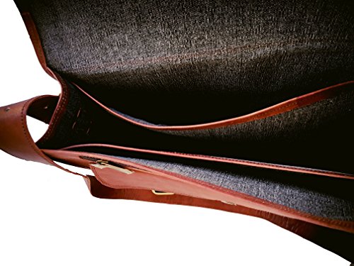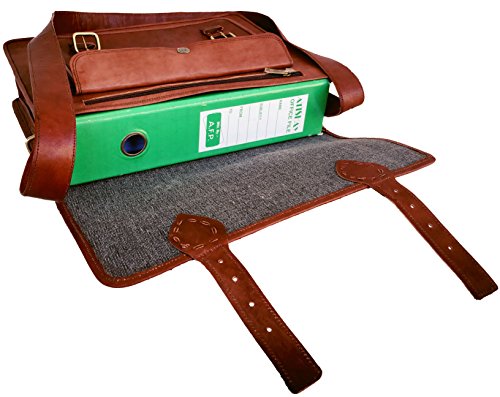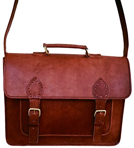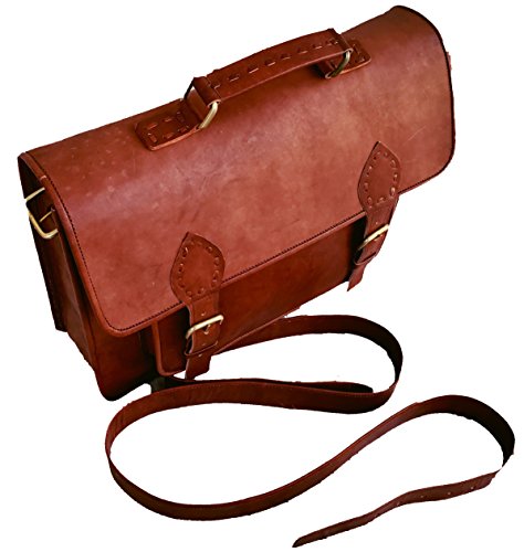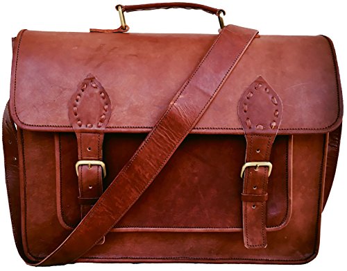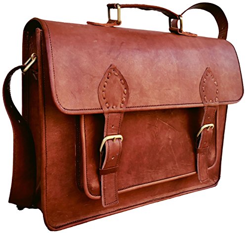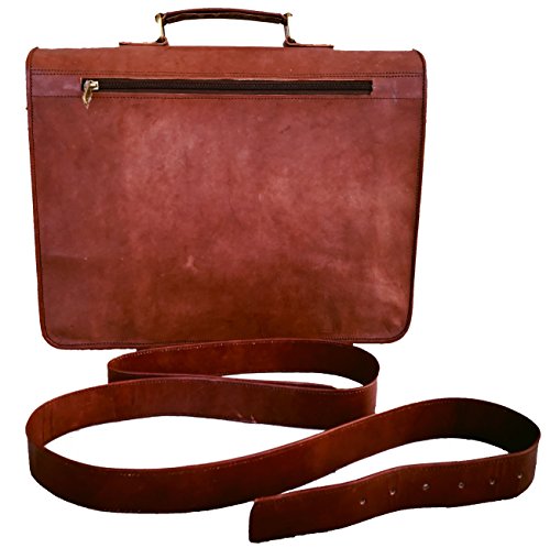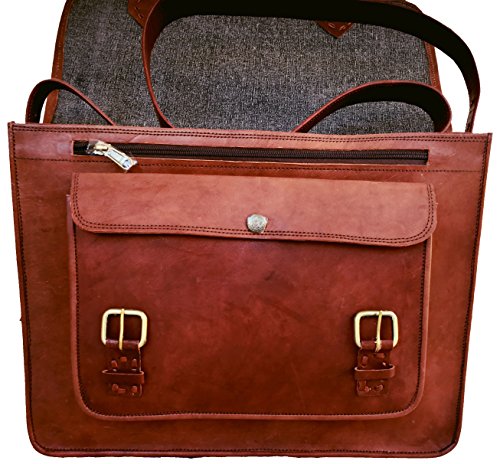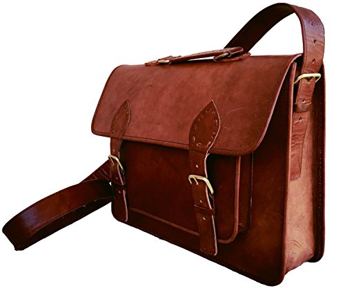 -. Feature : Dimensions: 15"x11"x4", 60 inch Adjustable Shoulder Strap. Fits upto 14" laptop easily. Walls are padded to keep the laptop safe. / as we work on premium quality leather please don't compare with other leather product. / 3 Compartment and 2 Zipper pocket and 1 big pocket in front size 11" wide X 7" height. / Original handmade leather bag natural process of tanningis used to make tan brown color, heavy metal fittings,and high quality canvas lining. NO Bad Odor. / Classic retro style laptop/college messenger bag.This bag has enough room for your books, laptop, files and other essentials. Leave an impression on your colleagues and your friends by this classic unisex bag.
